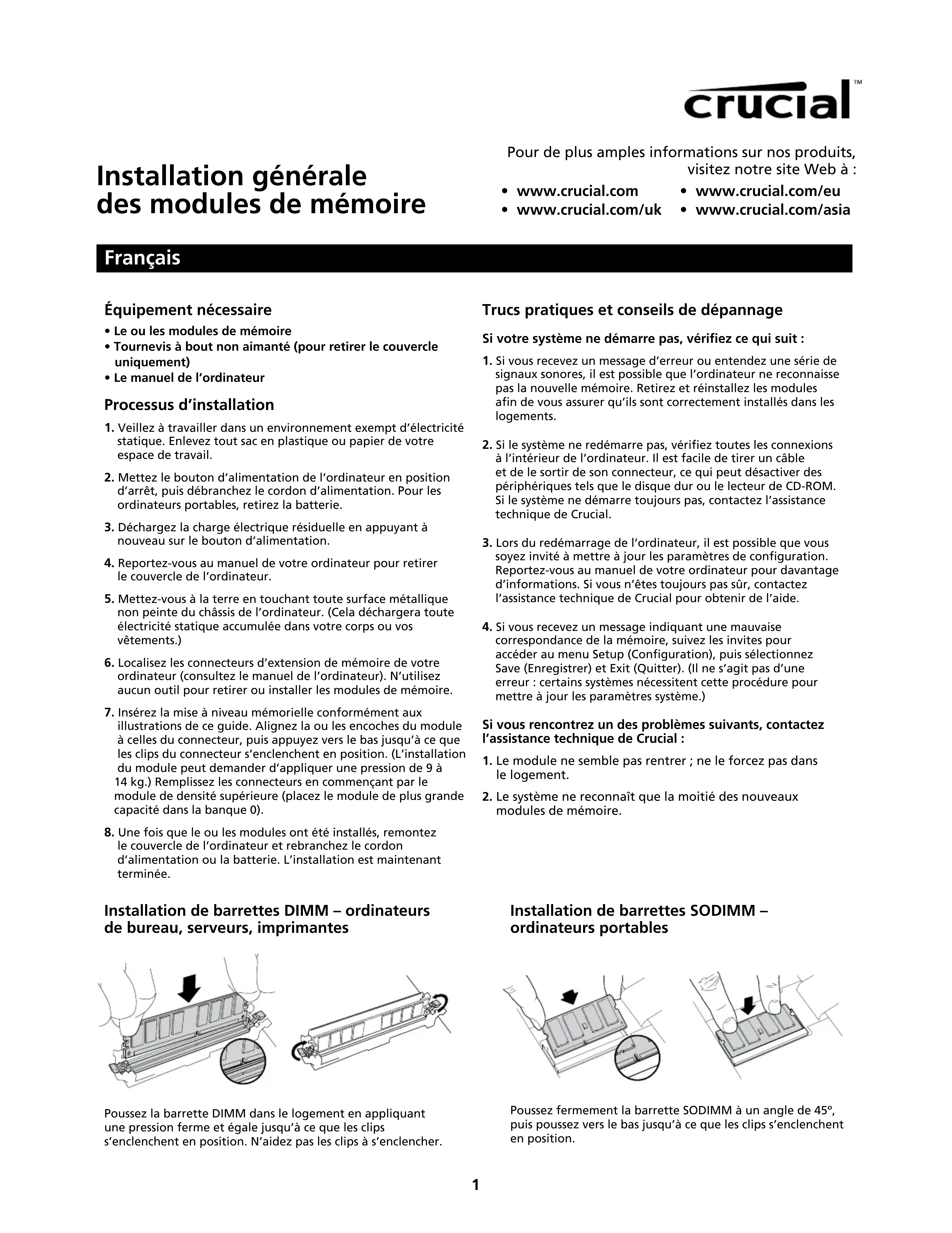 - Le ou les modules de mémoire• Tournevis à bout non aimanté (pour retirer le couvercle uniquement)• Le manuel de l’ordinateur Processus d’installation 1. Veillez à travailler dans un environnement exempt d’électricité statique. Enlevez tout sac en plastique ou papier de votre espace de travail.2. Mettez le bouton d’alimentation de l’ordinateur en position d’arrêt, puis débranchez le cordon d’alimentation. Pour les ordinateurs portables, retirez la batterie.3. Déchargez la charge électrique résiduelle en appuyant à nouveau sur le bouton d’alimentation.4. Reportez-vous au manuel de votre ordinateur pour retirer le couvercle de l’ordinateur.5. Mettez-vous à la terre en touchant toute surface métallique non peinte du châssis de l’ordinateur. (Cela déchargera toute électricité statique accumulée dans votre corps ou vos vêtements.)6. Localisez les connecteurs d’extension de mémoire de votre ordinateur (consultez le manuel de l’ordinateur). N’utilisez aucun outil pour retirer ou installer les modules de mémoire.7. Insérez la mise à niveau mémorielle conformément aux illustrations de ce guide. Alignez la ou les encoches du module à celles du connecteur, puis appuyez vers le bas jusqu’à ce que les clips du connecteur s’enclenchent en position. (L’installation du module peut demander d’appliquer une pression de 9 à 14 kg.) Remplissez les connecteurs en commençant par le module de densité supérieure (placez le module de plus grande capacité dans la banque 0).8. Une fois que le ou les modules ont été installés, remontez le couvercle de l’ordinateur et rebranchez le cordon d’alimentation ou la batterie. L’installation est maintenant terminée. Trucs pratiques et conseils de dépannage Si votre système ne démarre pas, vériez ce qui suit :1. Si vous recevez un message d’erreur ou entendez une série de signaux sonores, il est possible que l’ordinateur ne reconnaisse pas la nouvelle mémoire. Retirez et réinstallez les modules afin de vous assurer qu’ils sont correctement installés dans les logements.2. Si le système ne redémarre pas, vérifiez toutes les connexions à l’intérieur de l’ordinateur. Il est facile de tirer un câble et de le sortir de son connecteur, ce qui peut désactiver des périphériques tels que le disque dur ou le lecteur de CD-ROM. Si le système ne démarre toujours pas, contactez l’assistance technique de Crucial.3. Lors du redémarrage de l’ordinateur, il est possible que vous soyez invité à mettre à jour les paramètres de configuration. Reportez-vous au manuel de votre ordinateur pour davantage d’informations. Si vous n’êtes toujours pas sûr, contactez l’assistance technique de Crucial pour obtenir de l’aide.4. Si vous recevez un message indiquant une mauvaise correspondance de la mémoire, suivez les invites pour accéder au menu Setup (Configuration), puis sélectionnez Save (Enregistrer) et Exit (Quitter). (Il ne s’agit pas d’une erreur : certains systèmes nécessitent cette procédure pour mettre à jour les paramètres système.)Si vous rencontrez un des problèmes suivants, contactez l’assistance technique de Crucial :1. Le module ne semble pas rentrer ; ne le forcez pas dans le logement.2. Le système ne reconnaît que la moitié des nouveaux modules de mémoire. Installation de barrettes DIMM – ordinateurs de bureau, serveurs, imprimantes Poussez la barrette DIMM dans le logement en appliquant une pression ferme et égale jusqu’à ce que les clips s’enclenchent en position. N’aidez pas les clips à s’enclencher. Installation de barrettes SODIMM – ordinateurs portables Poussez fermement la barrette SODIMM à un angle de 45º, puis poussez vers le bas jusqu’à ce que les clips s’enclenchent en position.