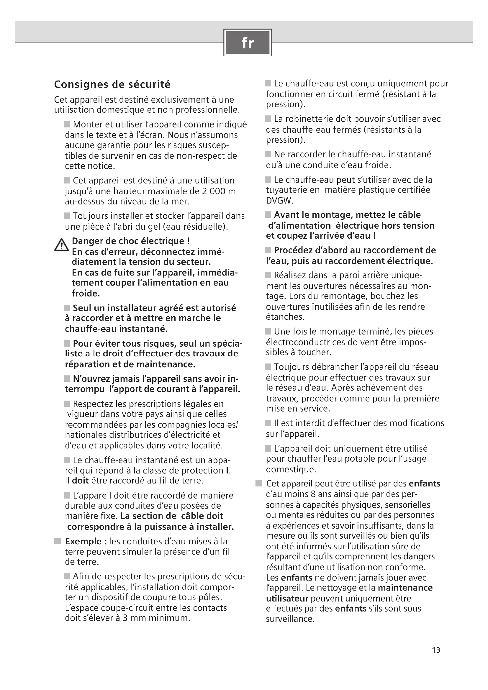 Consignes de sécurité Cet appareil est destiné exclusivement à une utilisation domestique et non professionnelle. ■ Monter et utiliser l’appareil comme indiqué dans le texte et à l’écran. Nous n’assumons aucune garantie pour les risques suscep- tibles de survenir en cas de non-respect de cette notice. ■ Cet appareil est destiné à une utilisation jusqu’à une hauteur maximale de 2 000 m au-dessus du niveau de la mer. ■ Toujours installer et stocker l’appareil dans une pièce à l’abri du gel (eau résiduelle). Danger de choc électrique ! En cas d’erreur, déconnectez immé- diatement la tension du secteur. En cas de fuite sur l’appareil, immédia- tement couper l’alimentation en eau froide. ■ Seul un installateur agréé est autorisé à raccorder et à mettre en marche le chauffe-eau instantané. ■ Pour éviter tous risques, seul un spécia- liste a le droit d’effectuer des travaux de réparation et de maintenance. ■ Nʼouvrez jamais l’appareil sans avoir in- terrompu l’apport de courant à l’appareil. ■ Respectez les prescriptions légales en vigueur dans votre pays ainsi que celles recommandées par les compagnies locales/ nationales distributrices d’électricité et d’eau et applicables dans votre localité. ■ Le chauffe-eau instantané est un appa- reil qui répond à la classe de protection I. Il doit être raccordé au fil de terre. ■ L’appareil doit être raccordé de manière durable aux conduites d’eau posées de manière fixe. La section de câble doit correspondre à la puissance à installer. ■ Exemple : les conduites d’eau mises à la terre peuvent simuler la présence d’un fil de terre. ■ Afin de respecter les prescriptions de sécu- rité applicables, l’installation doit compor- ter un dispositif de coupure tous pôles. L’espace coupe-circuit entre les contacts doit s’élever à 3 mm minimum. ■ Le chauffe-eau est conçu uniquement pour fonctionner en circuit fermé (résistant à la pression). ■ La robinetterie doit pouvoir s’utiliser avec des chauffe-eau fermés (résistants à la pression). ■ Ne raccorder le chauffe-eau instantané qu’à une conduite d’eau froide. ■ Le chauffe-eau peut s’utiliser avec de la tuyauterie en matière plastique certifiée DVGW. ■ Avant le montage, mettez le câble d’alimentation électrique hors tension et coupez l’arrivée d’eau ! ■ Procédez d’abord au raccordement de l’eau, puis au raccordement électrique. ■ Réalisez dans la paroi arrière unique- ment les ouvertures nécessaires au mon- tage. Lors du remontage, bouchez les ouvertures inutilisées afin de les rendre étanches. ■ Une fois le montage terminé, les pièces électroconductrices doivent être impos- sibles à toucher. ■ Toujours débrancher l’appareil du réseau électrique pour effectuer des travaux sur le réseau d’eau. Après achèvement des travaux, procéder comme pour la première mise en service. ■ Il est interdit d’effectuer des modifications sur l’appareil. ■ L’appareil doit uniquement être utilisé pour chauffer l’eau potable pour l’usage domestique. ■ Cet appareil peut être utilisé par des enfants d’au moins 8 ans ainsi que par des per- sonnes à capacités physiques, sensorielles ou mentales réduites ou par des personnes à expériences et savoir insuffisants, dans la mesure où ils sont surveillés ou bien qu’ils ont été informés sur l’utilisation sûre de l’appareil et qu’ils comprennent les dangers résultant d’une utilisation non conforme. Les enfants ne doivent jamais jouer avec l’appareil. Le nettoyage et la maintenance utilisateur peuvent uniquement être effectués par des enfants s’ils sont sous surveillance.14