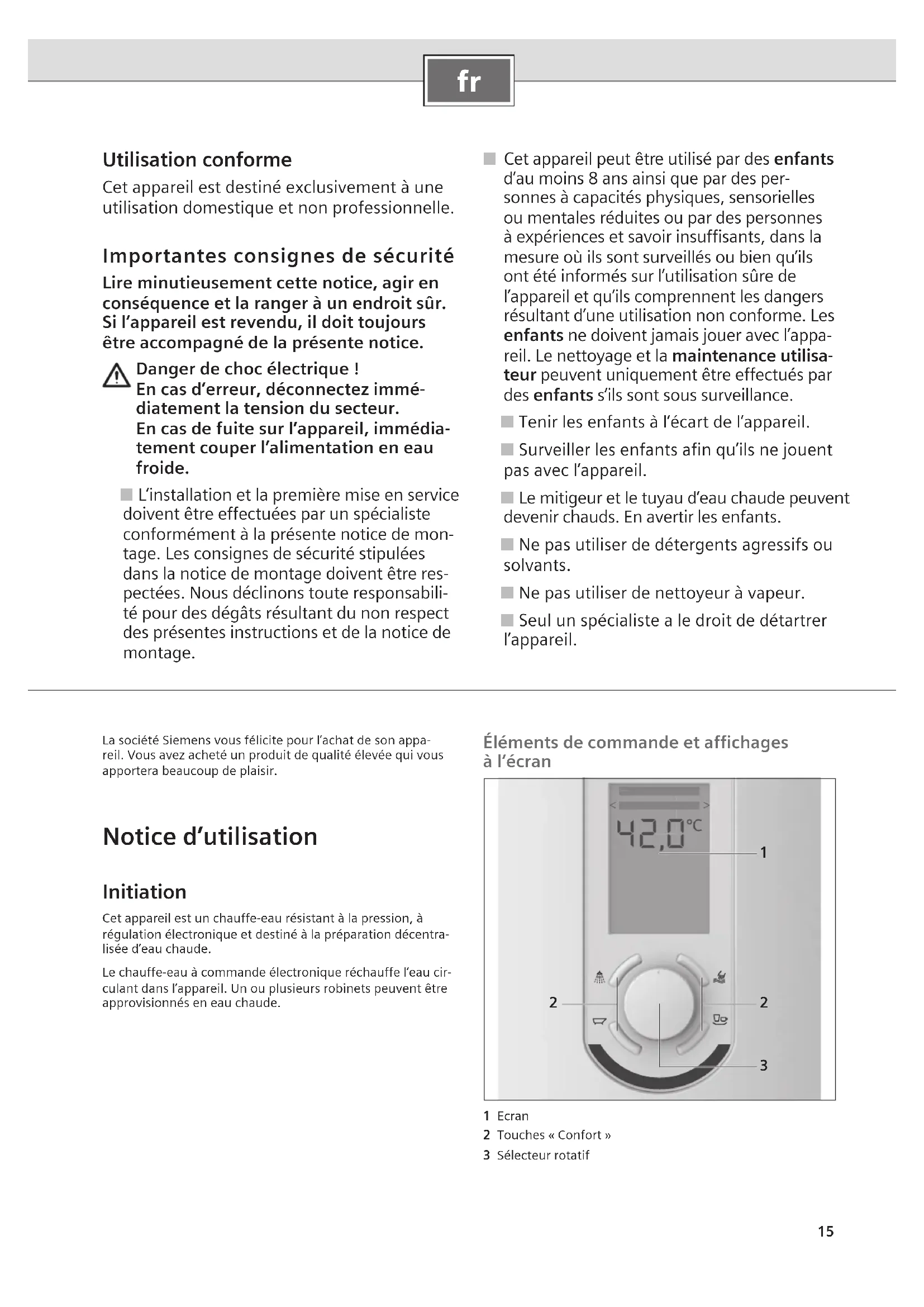 Utilisation conforme Cet appareil est destiné exclusivement à une utilisation domestique et non professionnelle. Importantes consignes de sécurité Lire minutieusement cette notice, agir en conséquence et la ranger à un endroit sûr. Si l’appareil est revendu, il doit toujours être accompagné de la présente notice. Danger de choc électrique ! En cas d’erreur, déconnectez immé- diatement la tension du secteur. En cas de fuite sur l’appareil, immédia- tement couper l’alimentation en eau froide. ■ L’installation et la première mise en service doivent être effectuées par un spécialiste conformément à la présente notice de mon- tage. Les consignes de sécurité stipulées dans la notice de montage doivent être res- pectées. Nous déclinons toute responsabili- té pour des dégâts résultant du non respect des présentes instructions et de la notice de montage. ■ Cet appareil peut être utilisé par des enfants d’au moins 8 ans ainsi que par des per- sonnes à capacités physiques, sensorielles ou mentales réduites ou par des personnes à expériences et savoir insuffisants, dans la mesure où ils sont surveillés ou bien qu’ils ont été informés sur l’utilisation sûre de l’appareil et qu’ils comprennent les dangers résultant d’une utilisation non conforme. Les enfants ne doivent jamais jouer avec l’appa- reil. Le nettoyage et la maintenance utilisa- teur peuvent uniquement être effectués par des enfants s’ils sont sous surveillance. ■ Tenir les enfants à l’écart de l’appareil. ■ Surveiller les enfants afin qu’ils ne jouent pas avec l’appareil. ■ Le mitigeur et le tuyau d’eau chaude peuvent devenir chauds. En avertir les enfants. ■ Ne pas utiliser de détergents agressifs ou solvants. ■ Ne pas utiliser de nettoyeur à vapeur. ■ Seul un spécialiste a le droit de détartrer l’appareil. La société Siemens vous félicite pour l’achat de son appa-reil. Vous avez acheté un produit de qualité élevée qui vous apportera beaucoup de plaisir. Notice d’utilisation Initiation Cet appareil est un chauffe-eau résistant à la pression, à régulation électronique et destiné à la préparation décentra-lisée d’eau chaude.Le chauffe-eau à commande électronique réchauffe l’eau cir-culant dans l’appareil. Un ou plusieurs robinets peuvent être approvisionnés en eau chaude. Éléments de commande et affichages à l’écran