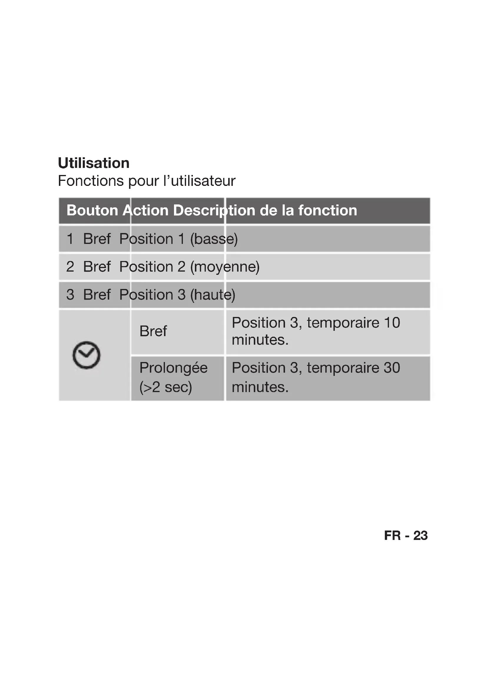 | Prolongée (>2 sec) | Position 3,temporaire 30 minutes. | |