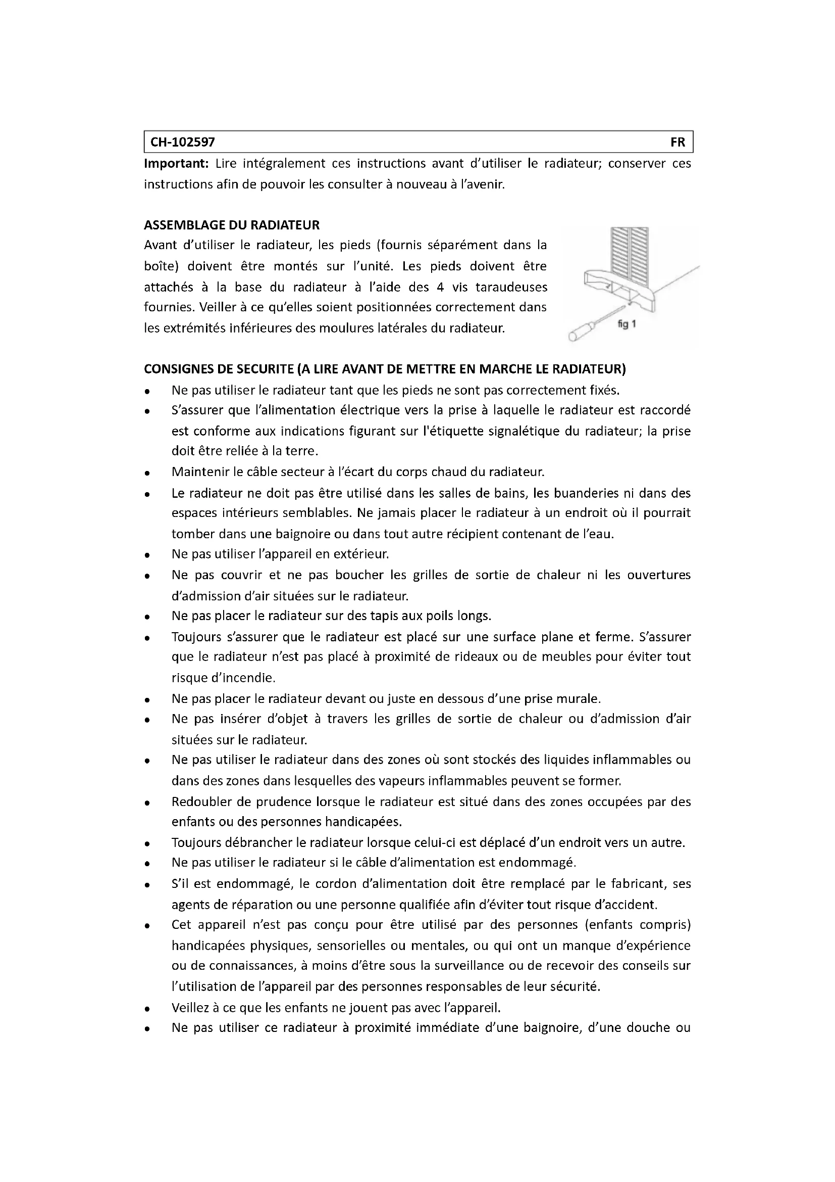- Ne pas utiliser le radiateur tant que les pieds ne sont pas correctement fixés.