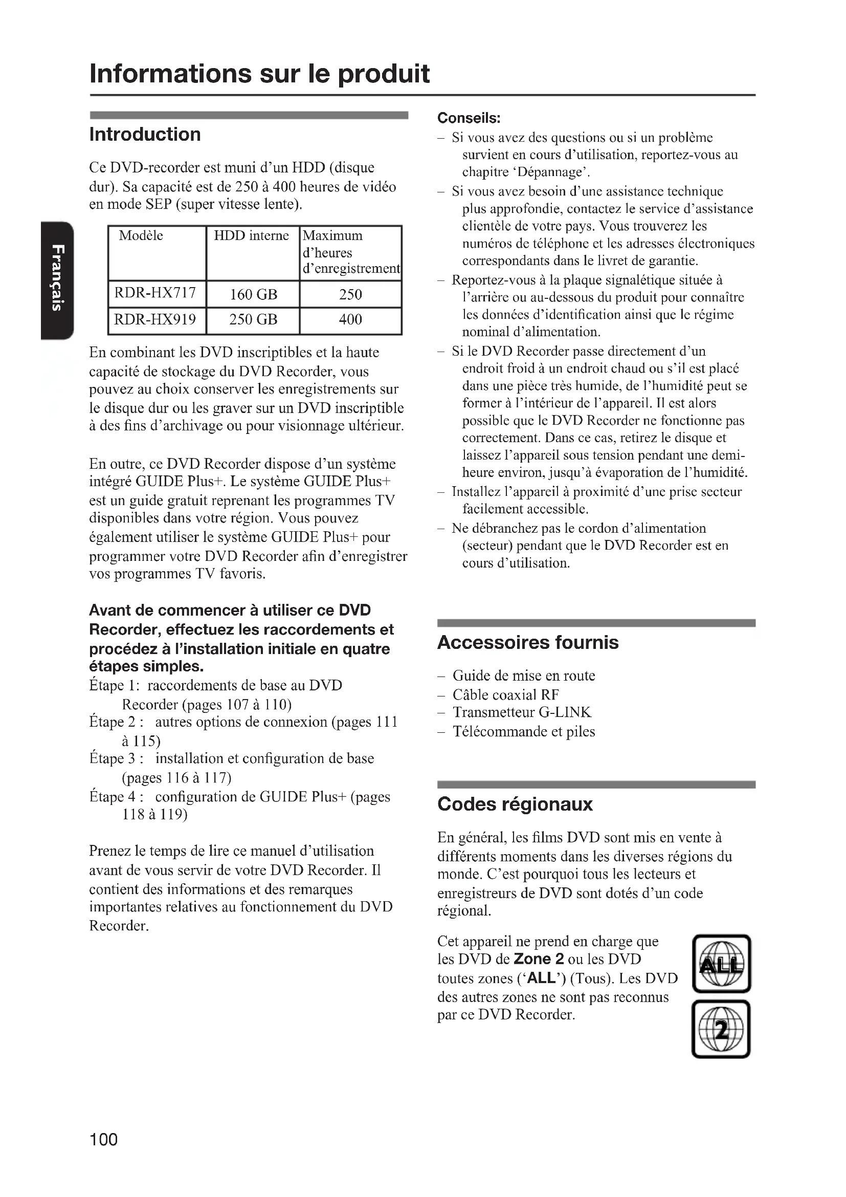 Français Introduction Ce DVD-recorder est muni d’un HDD (disque dur). Sa capacité est de 250 à 400 heures de vidéo en mode SEP (super vitesse lente).En combinant les DVD inscriptibles et la haute capacité de stockage du DVD Recorder, vous pouvez au choix conserver les enregistrements sur le disque dur ou les graver sur un DVD inscriptible à des fins d’archivage ou pour visionnage ultérieur. En outre, ce DVD Recorder dispose d’un système intégré GUIDE Plus+. Le système GUIDE Plus+ est un guide gratuit reprenant les programmes TV disponibles dans votre région. Vous pouvez également utiliser le système GUIDE Plus+ pour programmer votre DVD Recorder afin d’enregistrer vos programmes TV favoris. Avant de commencer à utiliser ce DVD Recorder, effectuez les raccordements et procédez à l’installation initiale en quatre étapes simples.Étape 1: raccordements de base au DVD Recorder (pages 107 à 110)Étape 2 : autres options de connexion (pages 111 à 115)Étape 3 : installation et configuration de base (pages 116 à 117)Étape 4 : configuration de GUIDE Plus+ (pages 118 à 119)Prenez le temps de lire ce manuel d’utilisation avant de vous servir de votre DVD Recorder. Il contient des informations et des remarques importantes relatives au fonctionnement du DVD Recorder. Conseils:– Si vous avez des questions ou si un problème survient en cours d’utilisation, reportez-vous au chapitre ‘Dépannage’. – Si vous avez besoin d’une assistance technique plus approfondie, contactez le service d’assistance clientèle de votre pays. Vous trouverez les numéros de téléphone et les adresses électroniques correspondants dans le livret de garantie. – Reportez-vous à la plaque signalétique située à l’arrière ou au-dessous du produit pour connaître les données d’identification ainsi que le régime nominal d’alimentation.– Si le DVD Recorder passe directement d’un endroit froid à un endroit chaud ou s’il est placé dans une pièce très humide, de l’humidité peut se former à l’intérieur de l’appareil. Il est alors possible que le DVD Recorder ne fonctionne pas correctement. Dans ce cas, retirez le disque et laissez l’appareil sous tension pendant une demi-heure environ, jusqu’à évaporation de l’humidité.– Installez l’appareil à proximité d’une prise secteur facilement accessible.– Ne débranchez pas le cordon d’alimentation (secteur) pendant que le DVD Recorder est en cours d’utilisation. Accessoires fournis – Guide de mise en route– Câble coaxial RF– Transmetteur G-LINK– Télécommande et piles Codes régionaux En général, les films DVD sont mis en vente à différents moments dans les diverses régions du monde. C’est pourquoi tous les lecteurs et enregistreurs de DVD sont dotés d’un code régional. Cet appareil ne prend en charge que les DVD de Zone 2 ou les DVD toutes zones (‘ALL’) (Tous). Les DVD des autres zones ne sont pas reconnus par ce DVD Recorder. Informations sur le produit ALL