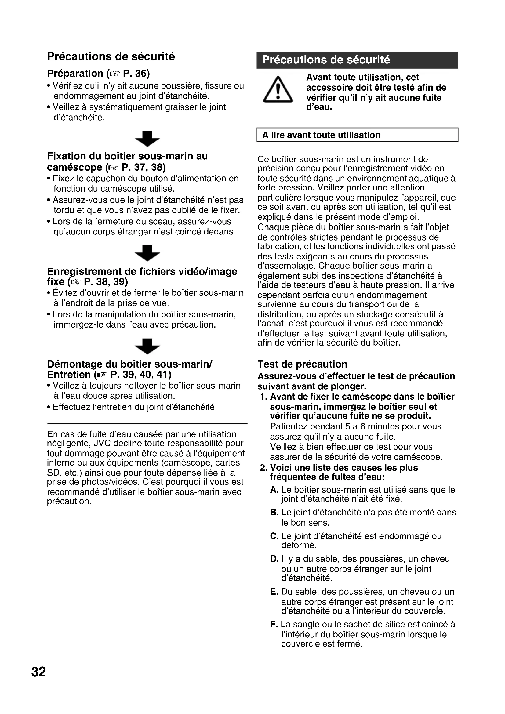 - Effectuez l’entretien du joint d’étanchéité. En cas de fuite d’eau causée par une utilisation négligente, JVC décline toute responsabilité pour tout dommage pouvant être causé à l’équipement interne ou aux équipements (caméscope, cartes SD, etc.) ainsi que pour toute dépense liée à la prise de photos/vidéos. C’est pourquoi il vous est recommandé d’utiliser le boîtier sous-marin avec précaution. Avant toute utilisation, cet accessoire doit être testé afin de vérifier qu’il n’y ait aucune fuite d’eau. Ce boîtier sous-marin est un instrument de précision conçu pour l’enregistrement vidéo en toute sécurité dans un environnement aquatique à forte pression. Veillez porter une attention particulière lorsque vous manipulez l’appareil, que ce soit avant ou après son utilisation, tel qu’il est expliqué dans le présent mode d’emploi. Chaque pièce du boîtier sous-marin a fait l’objet de contrôles strictes pendant le processus de fabrication, et les fonctions individuelles ont passé des tests exigeants au cours du processus d’assemblage. Chaque boîtier sous-marin a également subi des inspections d’étanchéité à l’aide de testeurs d’eau à haute pression. Il arrive cependant parfois qu’un endommagement survienne au cours du transport ou de la distribution, ou après un stockage consécutif à l’achat: c’est pourquoi il vous est recommandé d’effectuer le test suivant avant toute utilisation, afin de vérifier la sécurité du boîtier. Test de précaution Assurez-vous d’effectuer le test de précaution suivant avant de plonger.