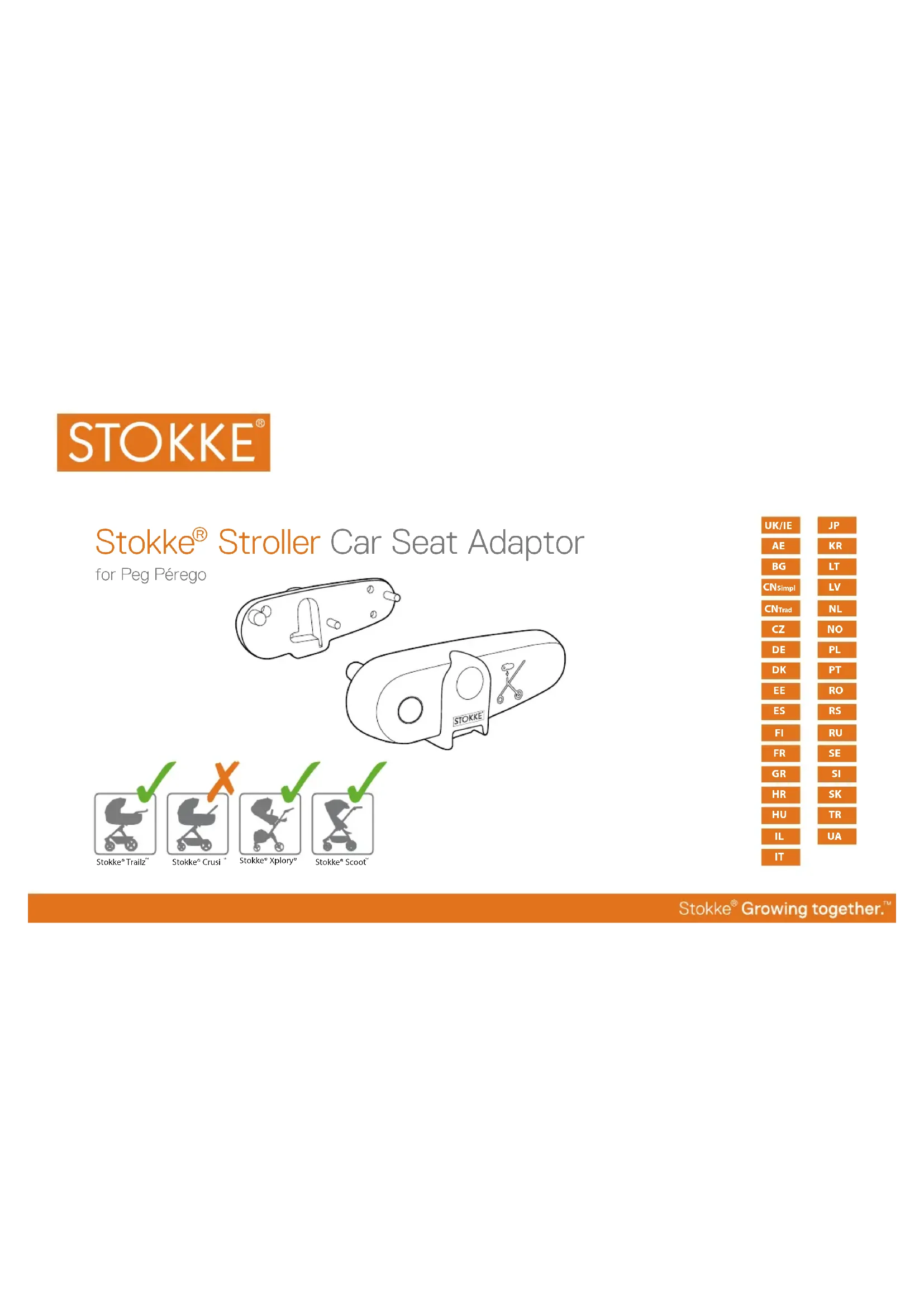 - Cet adaptateur pour siège auto doit être utilisé uniquement avec les châssis Stokke® Xplory®, Stokke® Trailz™ et Stokke® Scoot™ et les sièges auto Peg Perego approuvés. Pour obtenir la liste complète des sièges auto approuvés, visitez www.stokke.com.