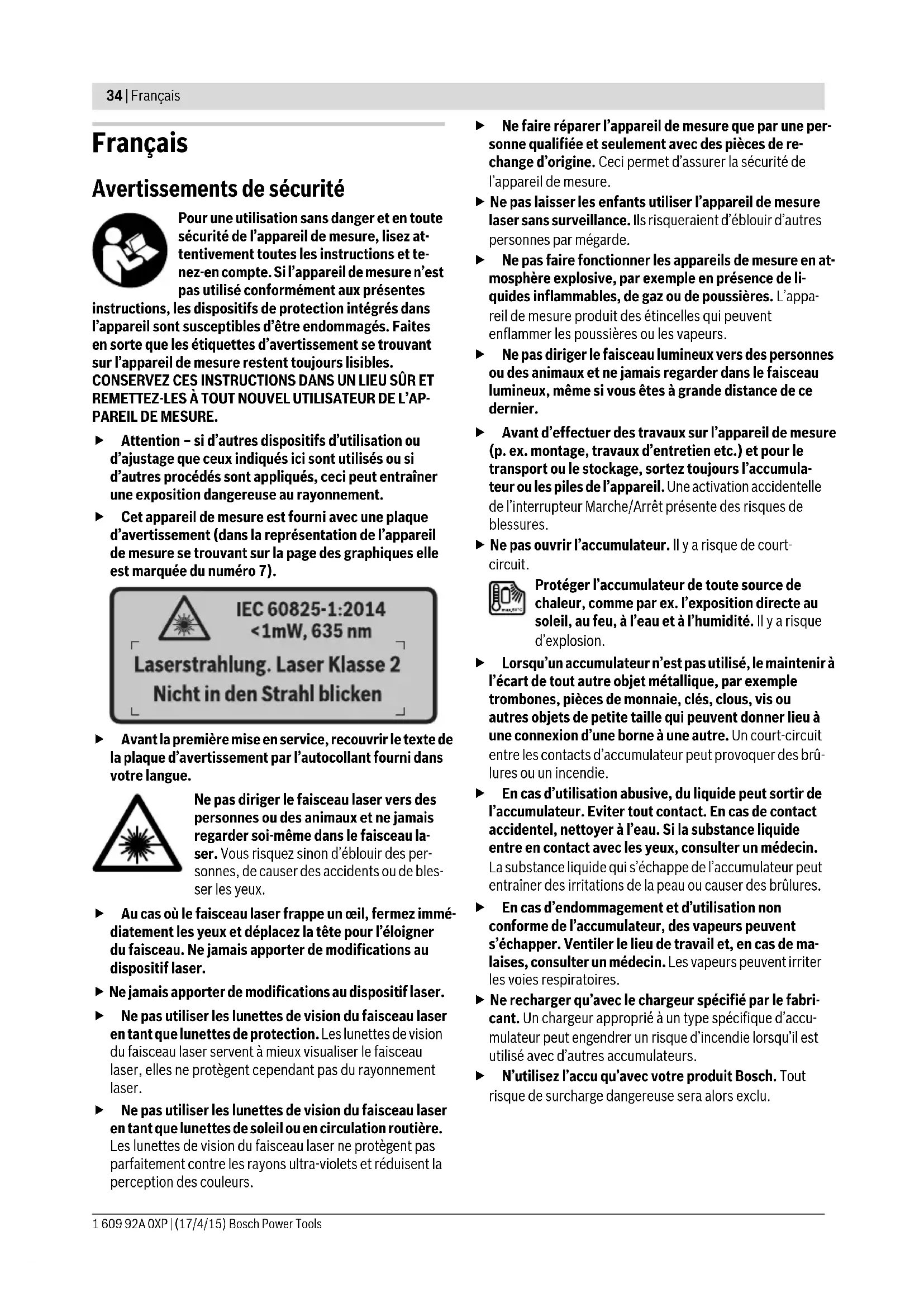–10...+50 °C –20...+70 °C Accus recommandés GBA 10,8V ... – Chargeurs recommandés AL 11.. CV – OBJ_BUCH-2270-002.book Page 36 Friday, April 17, 2015 9:48 AMFrançais | 37 Bosch Power Tools 1 609 92A 0XP | (17/4/15) Déclaration de conformité Nous déclarons sous notre propre responsabilité que le pro- duit décrit sous « Caractéristiques techniques » est conforme avec tous les termes des directives 2009/125/CE (règlement 1194/2012), 1999/5/CE, 2011/65/UE et leurs modifica- tions ultérieures ainsi qu’avec les normes suivantes : EN 61010-1:2010-10, EN 60825-1:2014-08, EN 300 328 V1.8.1:2012-06, EN 301 489-1 V1.8.1:2008-04, EN 301 489-1 V1.9.2:2011-09, EN 301 489-17 V2.2.1:2012-09, EN 62479:2010-09. Dossier technique auprès de : Robert Bosch GmbH, PT/ETM9, 70764 Leinfelden-Echterdingen, GERMANY Robert Bosch GmbH, Power Tools Division70764 Leinfelden-Echterdingen, GERMANYLeinfelden, 16.04.2015 Montage Alimentation en énergie L’appareil de mesure peut fonctionner avec des piles dispo- nibles dans le commerce ou un accumulateur Lithium-ion Bosch. Référence 3 601 K83 370 : L’appareil de mesure ne peut être utilisé qu’avec des piles usuelles du commerce. Utilisation avec piles (pas pour numéro d’article 3 601 K83 370) (voir figure A) Les piles doivent être insérées dans l’adaptateur de piles. L’adaptateur de piles est uniquement destiné à une uti- lisation sur les appareils de mesure Bosch prévus à cet effet. Il n’est pas conçu pour être utilisé avec des outils électroportatifs. Pour insérer les piles, poussez le corps 27 de l’adaptateur de batterie dans le compartiment à accu 29. Insérez comme re- présenté sur l’illustration les piles dans le couvercle 28. Glis- sez le couvercle au-dessus du corps jusqu’à ce qu’il s’en- clenche de manière audible sans dépasser de la poignée de l’appareil de mesure. Pour retirer les piles, pressez les pattes de déver- rouillage 3 du couvercle 28 et sortez le couvercle. Veillez ce faisant à ce que les piles ne tombent pas. Tenez pour cela l’appareil de mesure avec le com- partiment à accu 29 orienté vers le haut. Retirez les piles. Pour extraire le corps 27 de l’adaptateur de piles 29, glissez un doigt à l’intérieur du corps et sortez-le de l’appareil de mesure en exerçant une légère pression sur la paroi latérale. Remplacez toujours toutes les piles en même temps. N’utili- sez que des piles de la même marque avec la même capacité. Sortez les piles de l’appareil de mesure au cas où l’ap- pareil ne serait pas utilisé pendant une période prolon- gée. En cas de stockage prolongé, les piles peuvent se cor- roder et se décharger.