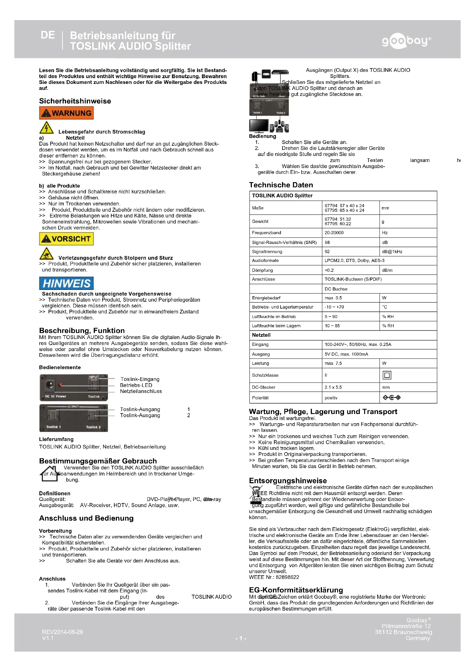 Gamme de fréquence 20-20000 Hz Rapport signal sur bruit (SNR) 98 dB Séparation 92 dB@1kHz Formats audio LPCM2.0, DTS, Dolby, AES-3 Atténuation <0.2 dB/m Connecteurs Douilles TOSLINK (S/PDIF) Douille DC Consommation d'énergie max. 0.5 W Température de fonctionnement et de stockage -10 ~ +70 °C Humidité en utilisation 5 ~ 90 % RH Humidité en stockage 10 ~ 85 % RH Adaptateur secteur Entée 100-240V~, 50/60Hz, max. 0.25A Sortie 5V DC, max. 1000mA Puissance max. 7.5 W Classe de protection II Fiche DC 2.1 x 5.5 mm Polarité positive Entretien, maintenance, stockage et transport Le produit ne nécessite aucun entretien. >> Laissez un professionnel de faire l‘entretien et les travaux de répa- ration. >> Utilisez uniquement un chiffon doux et sec pour le nettoyage. >> Ne pas utiliser de détergents ou de produits chimiques. >> Magasin endroit frais et sec. >> Transport le produit dans son emballage d‘origine. >> Attendez pour les grandes différences de température après le dépla- cement de quelques minutes avant de mettre l‘appareil en service. Instructions pour l’élimination Selon la directive européenne DEEE, la mise au rebut des appareils électriques et électroniques avec les déchets domestiques est strictement interdite. Leurs composants doivent être recyclés ou éliminés de façon séparée. Autrement les substances contaminées et dangereuses peuvent polluer notre environnement. Vous, en tant que consommateur, êtes commis par la loi à la mise au rebut des appareils électriques et électroniques auprès du fabricant, du distributeur, ou despointspublicsdecollecteàlandeladuréedeviedesdispositifs,etcede façon gratuite. Les détails sont réglementés dans le droit national. Le symbole sur le produit, dans le manuel d‘utilisation, ou sur l‘emballage fait référence à ces termes. Avec ce genre de séparation des déchets, d‘application et d‘élimi- nation des déchets d‘appareils usagés, vous réalisez une part importante de la protection de l‘environnement. No DEEE : 82898622 Déclaration EC En utilisant le marquage CE, Goobay®, nom commercial déposé de Wentronic GmbH, déclare que l‘appareil est conforme aux conditions et directives de base de la réglementation européenne.Istruzioni per l‘uso per Distributore TOSLINK AUDIO