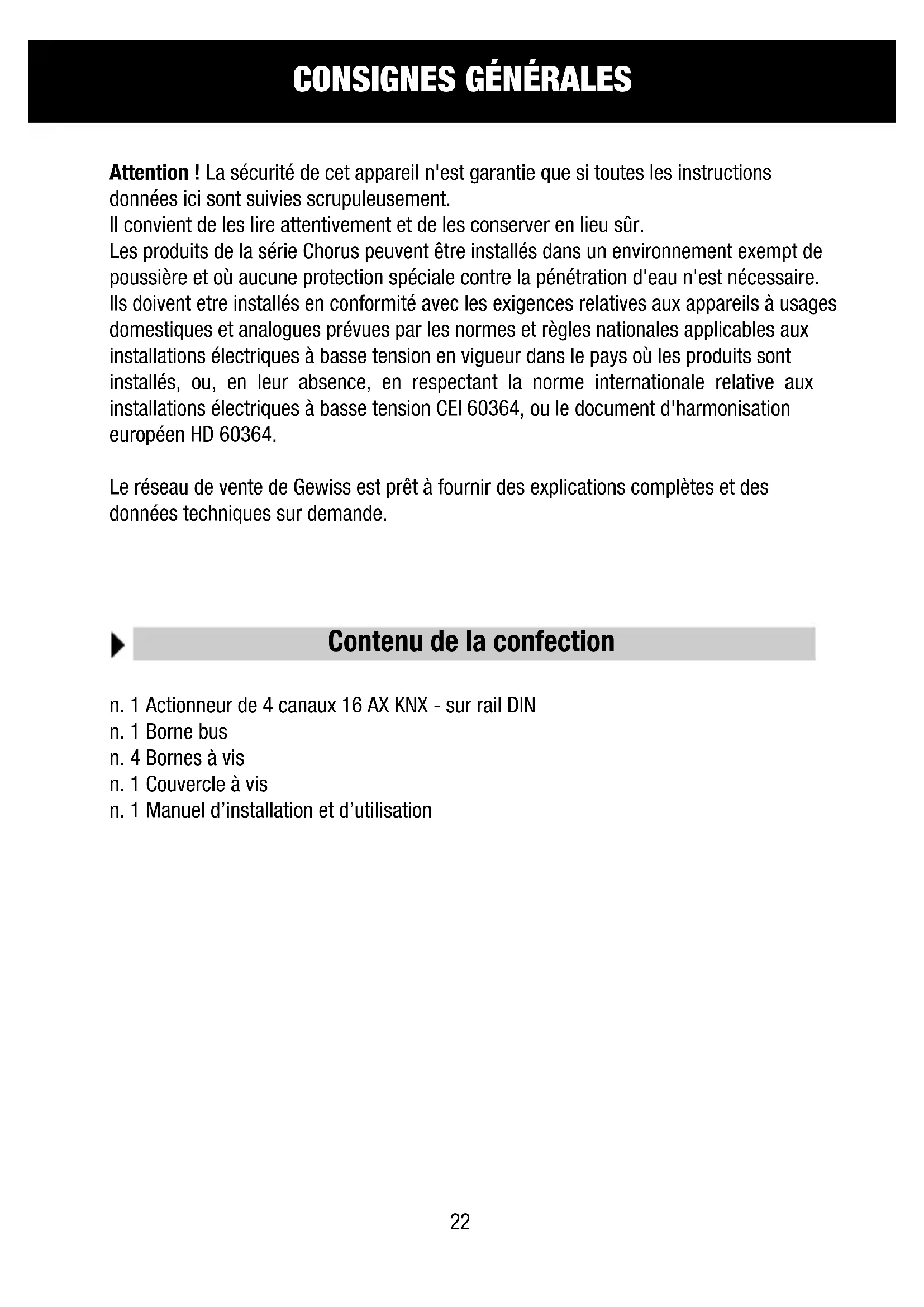 Les produits de la série Chorus peuvent être installés dans un environnement exempt de poussière et où aucune protection spéciale contre la pénétration d'eau n'est nécessaire. Ils doivent être installés en conformité avec les exigences relatives aux appareils à usages domestiques et analogues prévues par les normes et règles nationales applicables aux installations électriques à basse tension en vigueur dans le pays où les produits sont installés, ou, en leur absence, en respectant la norme internationale relative aux installations électriques à basse tension CEI 60364, ou le document d'harmonisation européen HD 60364.