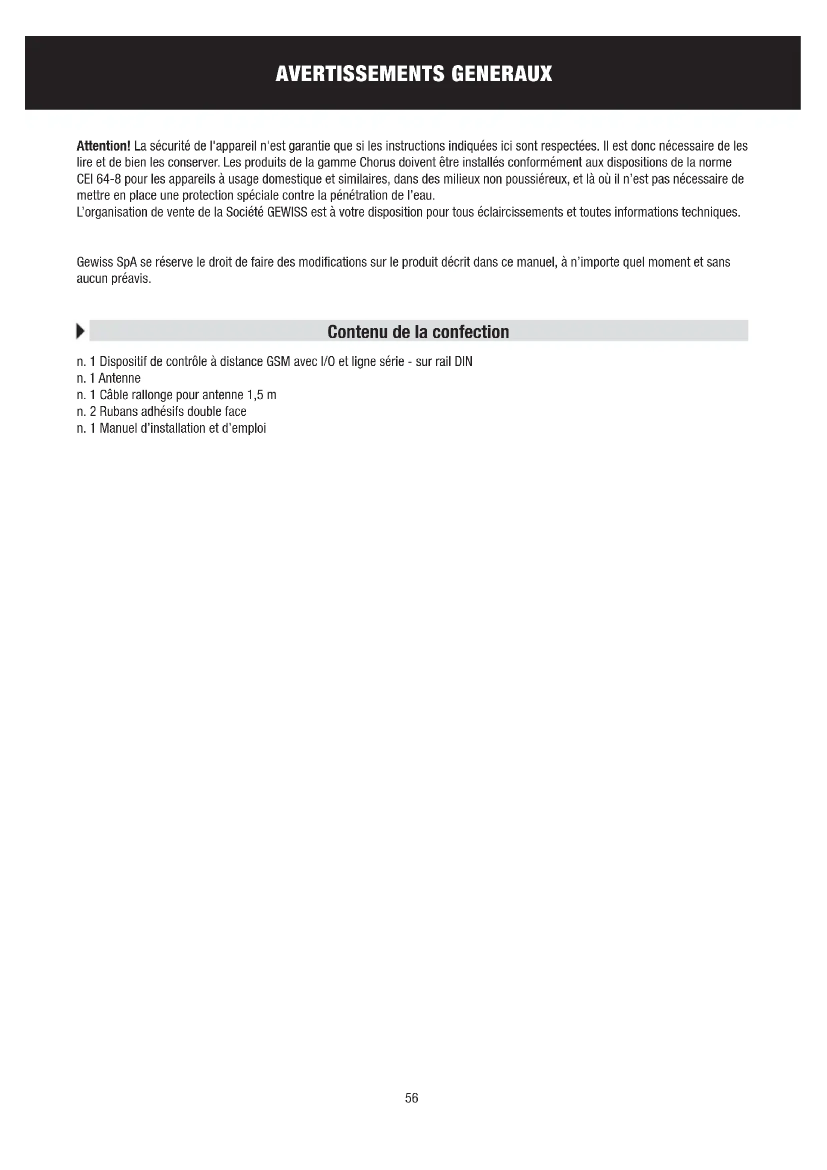 Attention! La sécurité de l'appareil n'est garantie que si les instructions indiquées ici sont respectees. Il est donc nécessaire de les dire et de bien les conserver. Les produits de la gamme Chorus doivent etre installés conformément aux dispositions de la norme CEI 64-8 pour les appareils a usage domestique et similaires, dans des milieux non poussiereux, et la ou il n'est pas nécessaire de mettre en place une protection speciale contre la pénétration de I'eau.