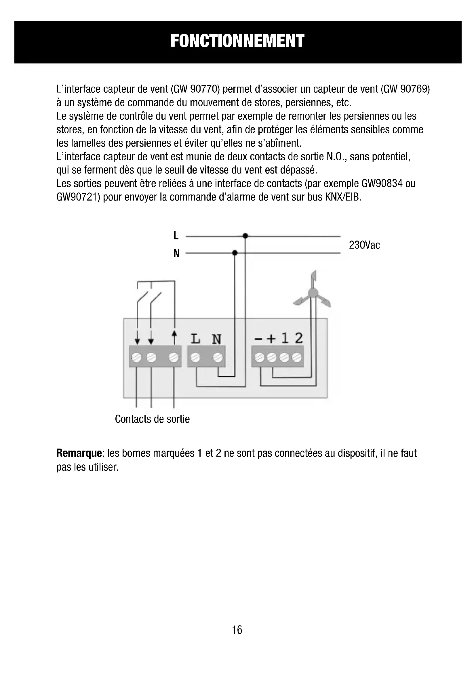 L'interface capteur de vent est munie de deux contacts de sortie N.O., sans potentiel, qui se ferment dès que le seuil de vitesse du vent est dépassé.