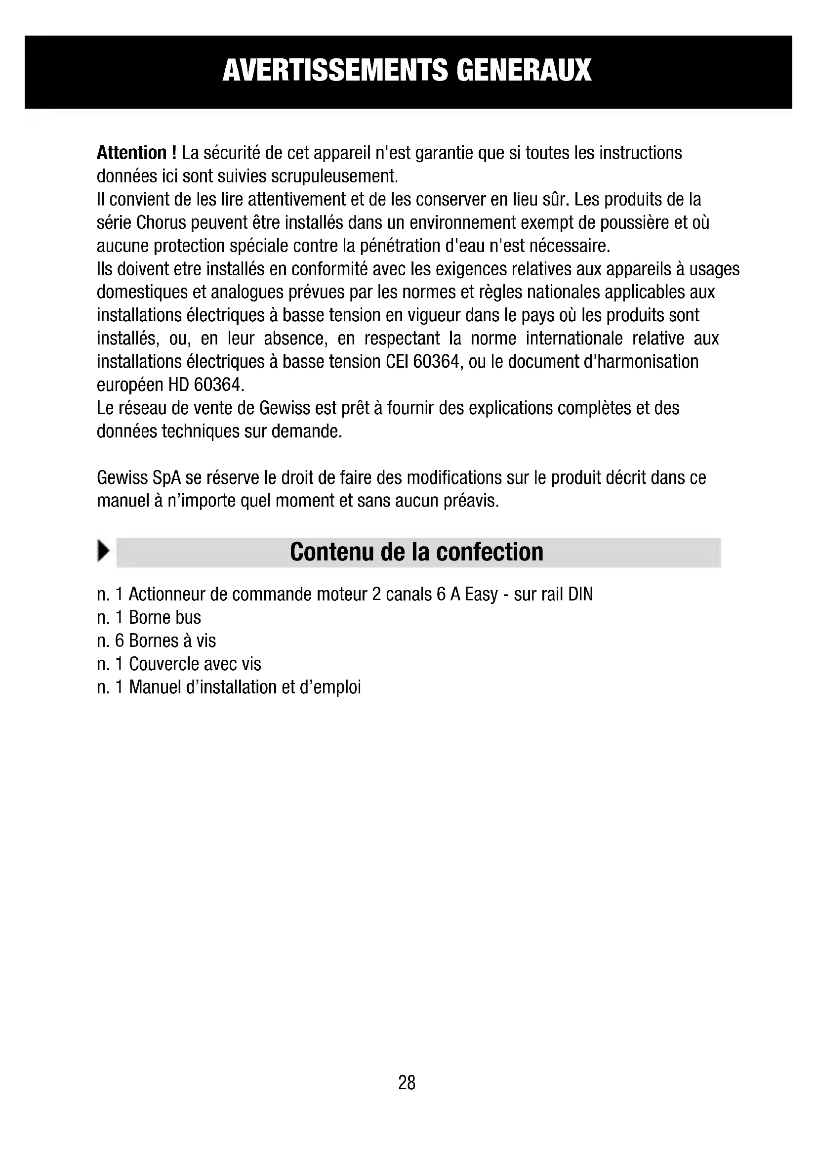 Gewiss SpA se reserve le droit de faire des modifications sur le produit précrit dans ce manuel à n'importe quel moment et sans aucun préavis.