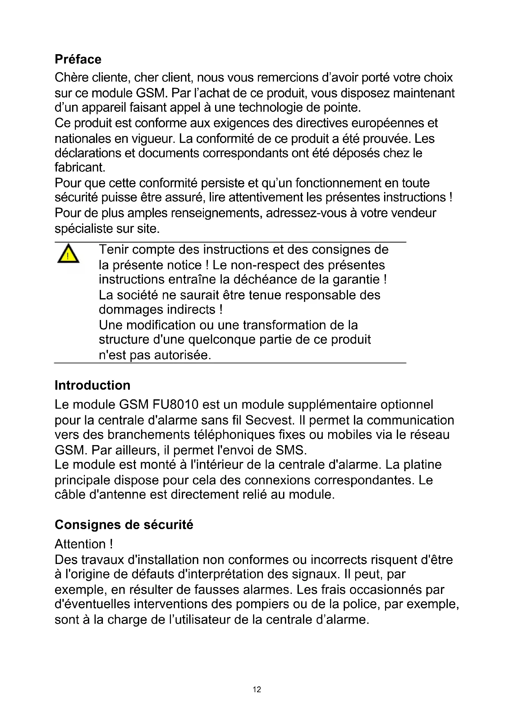 Tenir compte des instructions et des consignes de la présente notice ! Le non-respect des présentes instructions entraîne la déchéance de la garantie ! La société ne saurait être tenue responsable des dommages indirects ! Une modification ou une transformation de la structure d'une quelconque partie de ce produit n'est pas autorisée. Introduction Le module GSM FU8010 est un module supplémentaire optionnel pour la centrale d'alarme sans fil Secvest. Il permet la communication vers des branchements téléphoniques fixes ou mobiles via le réseau GSM. Par ailleurs, il permet l'envoi de SMS. Le module est monté à l'intérieur de la centrale d'alarme. La platine principale dispose pour cela des connexions correspondantes. Le câble d'antenne est directement relié au module. Consignes de sécurité Attention ! Des travaux d'installation non conformes ou incorrects risquent d'être à l'origine de défauts d'interprétation des signaux. Il peut, par exemple, en résulter de fausses alarmes. Les frais occasionnés par d'éventuelles interventions des pompiers ou de la police, par exemple, sont à la charge de l’utilisateur de la centrale d’alarme.
