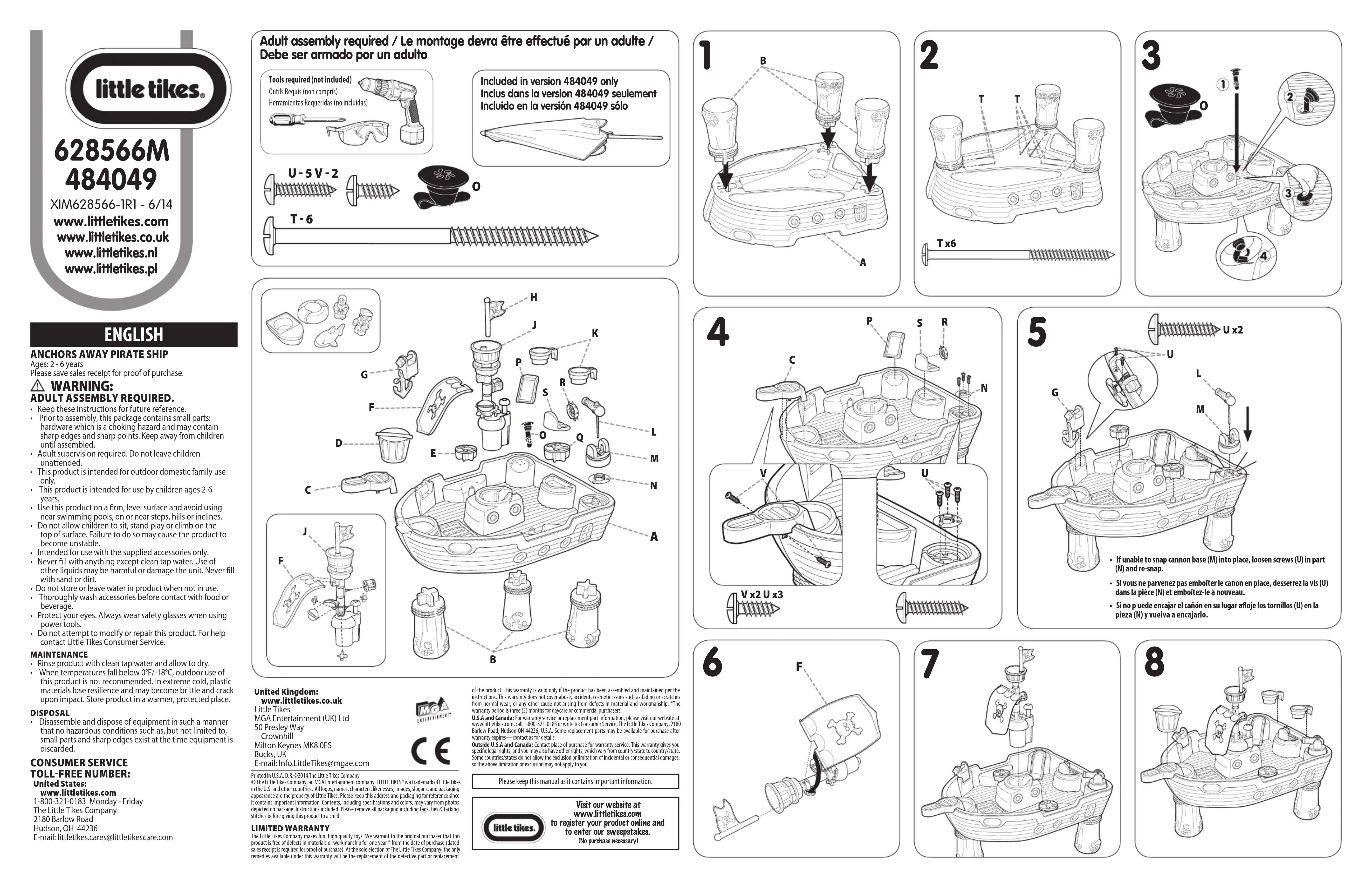 États-Unis et Canada : Pour obtenir des informations sur le service de garantie ou de remplacement des pièces veuillez visiter note site Web : www.littletiles.com, appeler le 1-800-321-0183 ou écrine à: Consumer Service, The Little Tibes Company, 2180 Barlow Road, Hudson OH 44236, U.S.A. Certaines pièces de rechange peuvent être achetées après l'expiration de la garantie – veuillez nous contacter pour obtenir de plus amples informations.