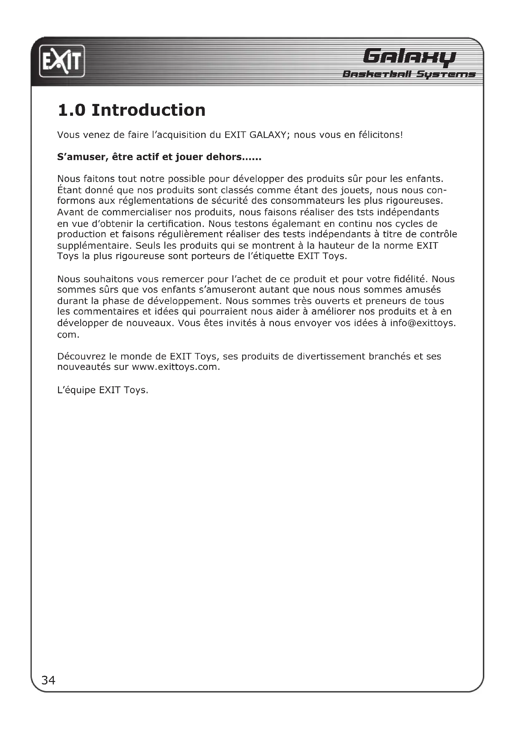 - Tous les systèmes de basketball EXIT Galaxy, y compris ceux utilisés en Exposition doivent être assemblés, selon les instructions. Suivez ces instructions sous peine d'encourir des BLESSURES GRAVES.