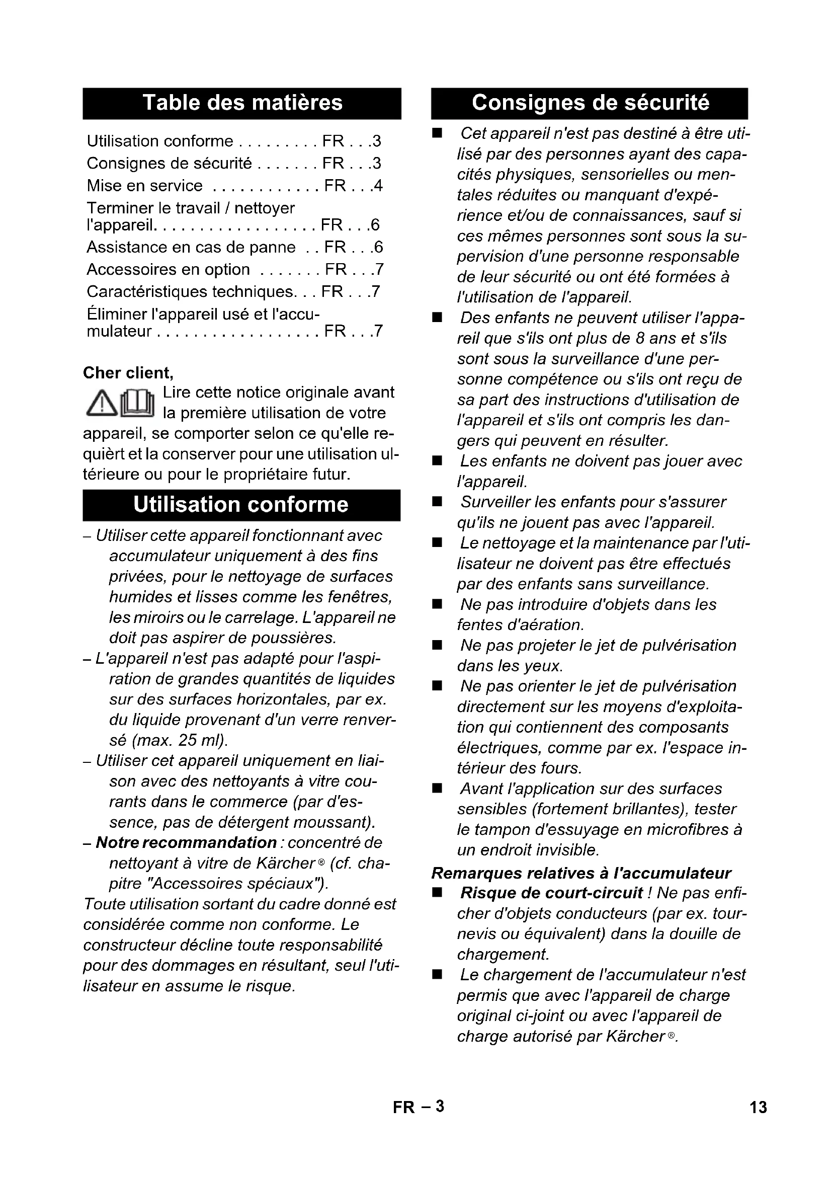 (cf. cha- pitre "Accessoires spéciaux"). Toute utilisation sortant du cadre donné est considérée comme non conforme. Le constructeur décline toute responsabilité pour des dommages en résultant, seul l'uti- lisateur en assume le risque. Cet appareil n'est pas destiné à être uti- lisé par des personnes ayant des capa- cités physiques, sensorielles ou men- tales réduites ou manquant d'expé- rience et/ou de connaissances, sauf si ces mêmes personnes sont sous la su- pervision d'une personne responsable de leur sécurité ou ont été formées à l'utilisation de l'appareil. Des enfants ne peuvent utiliser l'appa- reil que s'ils ont plus de 8 ans et s'ils sont sous la surveillance d'une per- sonne compétence ou s'ils ont reçu de sa part des instructions d'utilisation de l'appareil et s'ils ont compris les dan- gers qui peuvent en résulter. Les enfants ne doivent pas jouer avec l'appareil. Surveiller les enfants pour s'assurer qu'ils ne jouent pas avec l'appareil. Le nettoyage et la maintenance par l'uti- lisateur ne doivent pas être effectués par des enfants sans surveillance. Ne pas introduire d'objets dans les fentes d'aération. Ne pas projeter le jet de pulvérisation dans les yeux. Ne pas orienter le jet de pulvérisation directement sur les moyens d'exploita- tion qui contiennent des composants électriques, comme par ex. l'espace in- térieur des fours. Avant l'application sur des surfaces sensibles (fortement brillantes), tester le tampon d'essuyage en microfibres à un endroit invisible. Remarques relatives à l'accumulateur Risque de court-circuit ! Ne pas enfi- cher d'objets conducteurs (par ex. tour- nevis ou équivalent) dans la douille de chargement. Le chargement de l'accumulateur n'est permis que avec l'appareil de charge original ci-joint ou avec l'appareil de charge autorisé par Kärcher