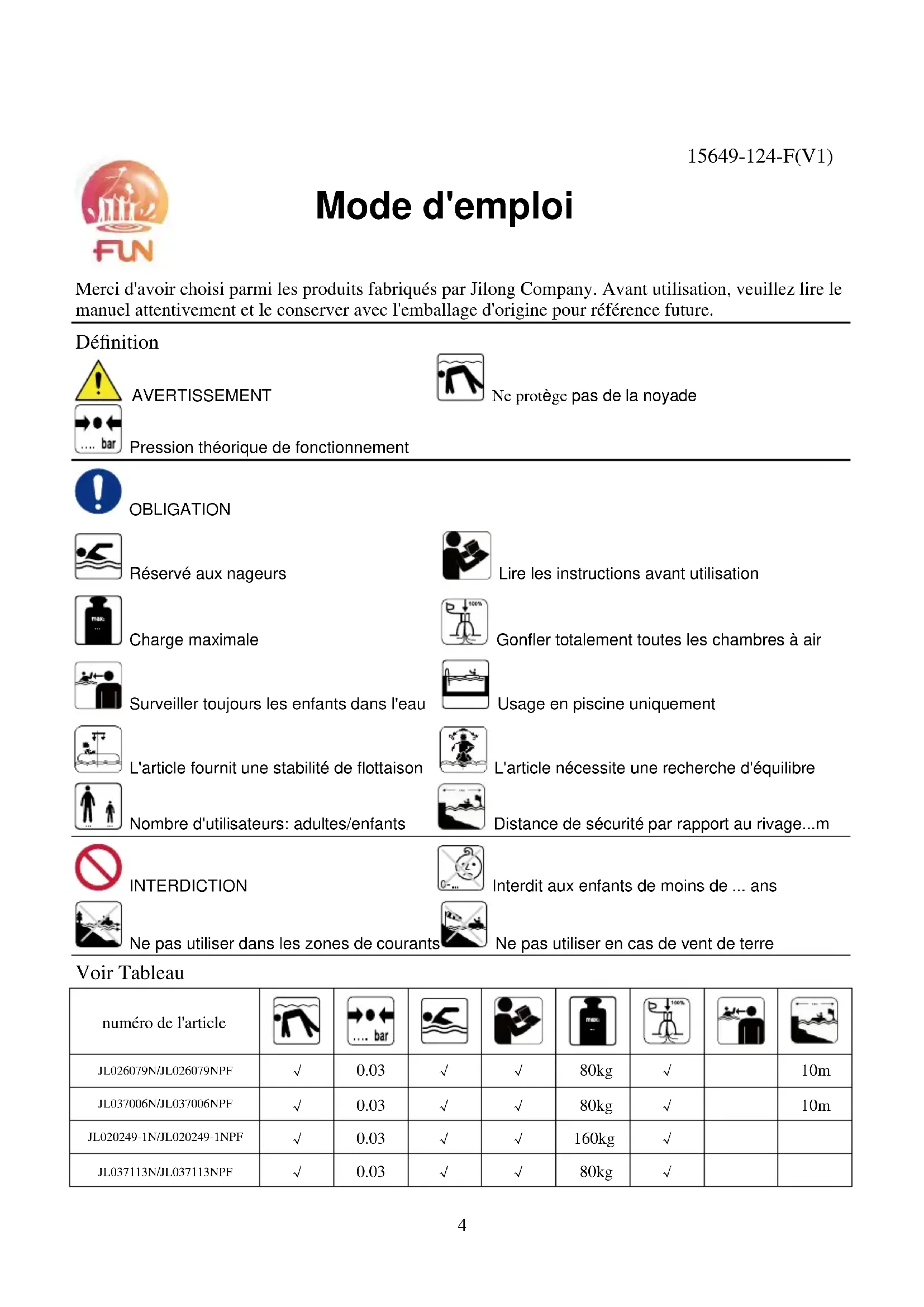 for the children. Repair Patch Instructions (Small pinhole and small puncture leaks can be repaired with the included repair patch) a) Locate the leak place. b) Deflate the air. c) Clean the area surrounding the leakage and wipe up all water from the surface. d) Take out the repair patch, cut it into required shape and size, which should be litter larger than the leaking area, put the patch on leaking area and press firmly. e) You can use it again after 24 hours drying of the repaired position. If the damage is bigger than 1” (2.5cm), we recommend using a Silicone or rubber based glue for repair. Please read warning statement on glue prior to use. Shanghai Jilong Plastic Products Co. Ltd. No. 460 Lanxue Road, Huanglou, Pudong Area, Shanghai, 201205, P.R. China Tel: +86-21-58942200 E-mail: info@jilong.com Web: www.jilong.com4 Merci d'avoir choisi parmi les produits fabriqués par Jilong Company. Avant utilisation, veuillez lire le manuel attentivement et le conserver avec l'emballage d'origine pour référence future. Définition AVERTISSEMENT Ne protège pas de la noyade Pression théorique de fonctionnement OBLIGATION Réservé aux nageurs Lire les instructions avant utilisation Charge maximale Gonfler totalement toutes les chambres à air Surveiller toujours les enfants dans l'eau Usage en piscine uniquement L'article fournit une stabilité de flottaison L'article nécessite une recherche d'équilibre Nombre d'utilisateurs: adultes/enfants Distance de sécurité par rapport au rivage...m INTERDICTION Interdit aux enfants de moins de ... ans Ne pas utiliser dans les zones de courants Ne pas utiliser en cas de vent de terre Voir Tableau numéro de l'article