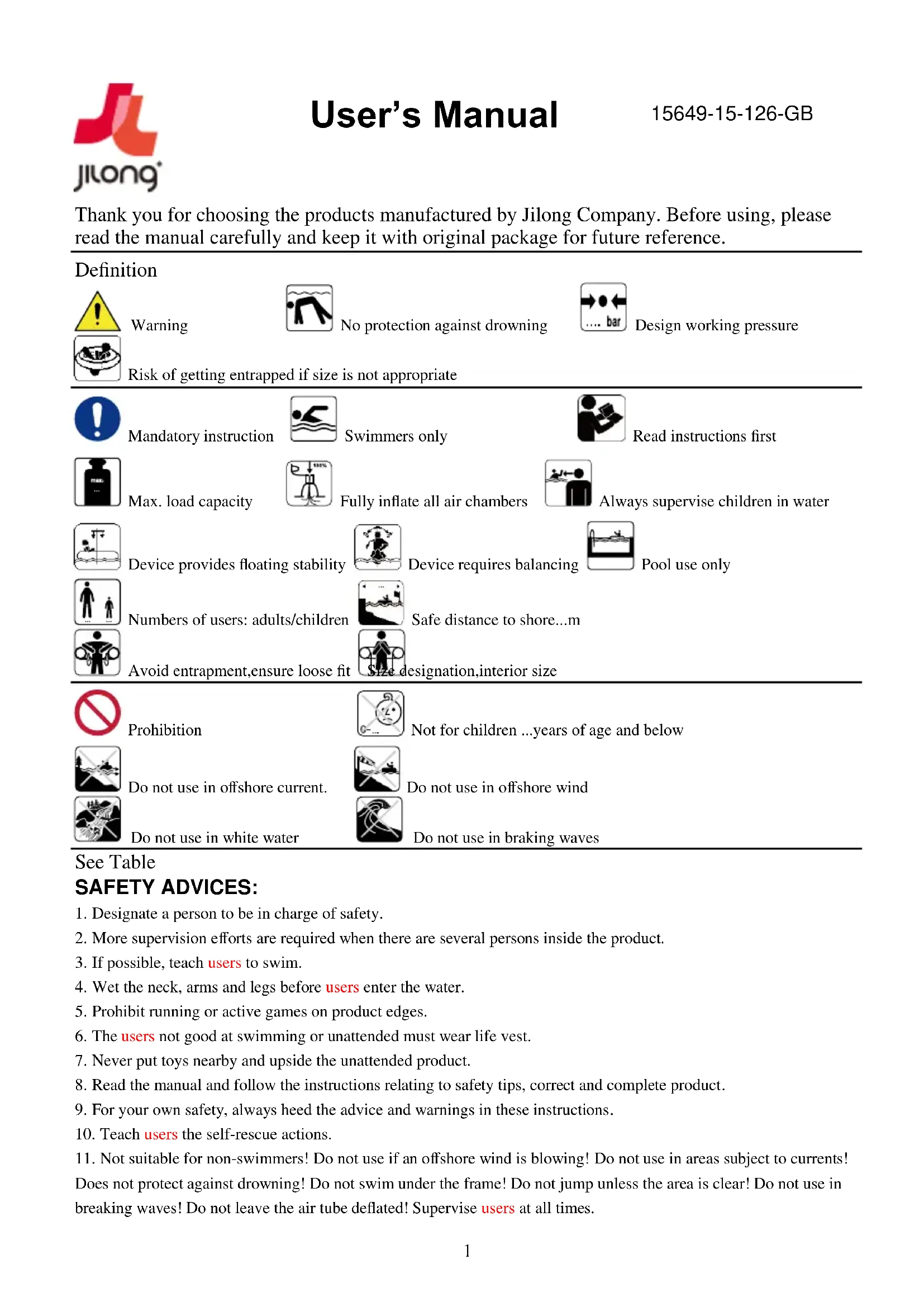 Repair Patch Instructions (Small pinhole and small puncture leaks can be repaired with the included repair patch) a) Locate the leak place. b) Deflate the air. c) Clean the area surrounding the leakage and wipe up all water from the surface. d) Take out the repair patch, cut it into required shape and size, which should be litter larger than the leaking area, put the patch on leaking area and press firmly. e) You can use it again after 30 minutes drying of the repaired position. If the damage is bigger than 1” (2.5cm), we recommend using a Silicone or rubber based glue for repair. Please read warning statement on glue prior to use. Shanghai Jilong Plastic Products Co. Ltd. No. 460 Lanxue Road, Huanglou, Pudong Area, Shanghai, 201205, P.R. China Tel: +86-21-58942200 E-mail: info@jilong.com Web: www.jilong.com3 Merci d'avoir choisi parmi les produits fabriqués par Jilong Company. Avant utilisation, veuillez lire le manuel attentivement et le conserver avec l'emballage d'origine pour référence future. Définition AVERTISSEMENT Pression théorique de fonctionnement Ne protège pas de la noyade Risque de coincement si les dimensions ne sont pas appropriées OBLIGATION Réservé aux nageurs Lire les instructions avant utilisation Charge maximale Gonfler totalement toutes les chambres à air Surveiller toujours les enfants dans l'eau Usage en piscine uniquement L'article fournit une stabilité de flottaison L'article nécessite une recherche d'équilibre Nombre d'utilisateurs: adultes/enfants Distance de sécurité par rapport au rivage...m Risque de coincement, assurer un ajustement libre Désignation des dimensions,dimensions intérieures INTERDICTION Interdit aux enfants de moins de ... ans Ne pas utiliser dans les zones de courants Ne pas utiliser en cas de vent de terre Ne pas utiliser en eaux vives Ne pas utiliser dans les vagues déferlantes Voir Tableau INSTRUCTIONS RELATIVES À LA SÉCURITÉ: