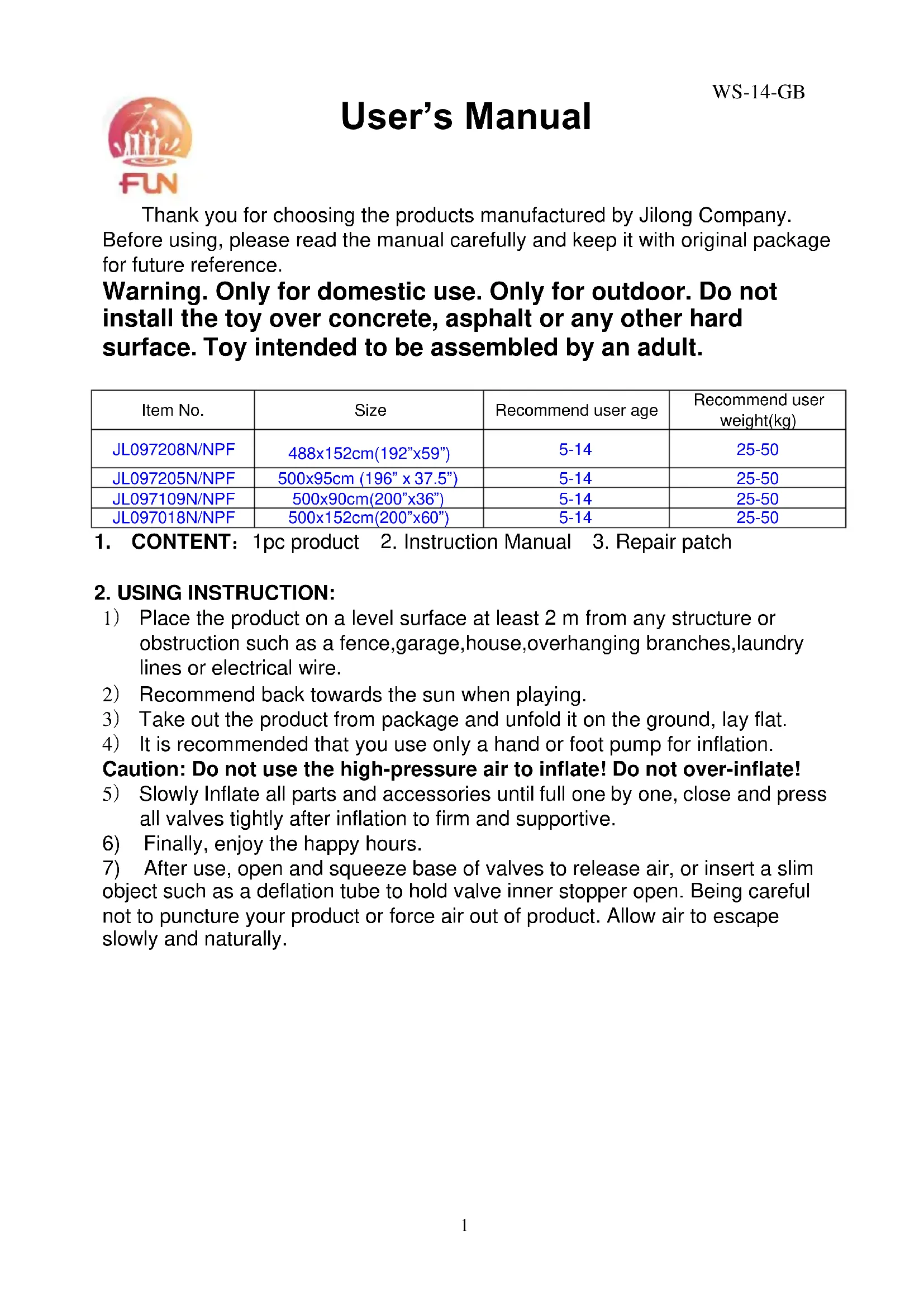 JL097205NPF - Jeu gonflable JILONG - Notice d'utilisation et mode d'emploi gratuit