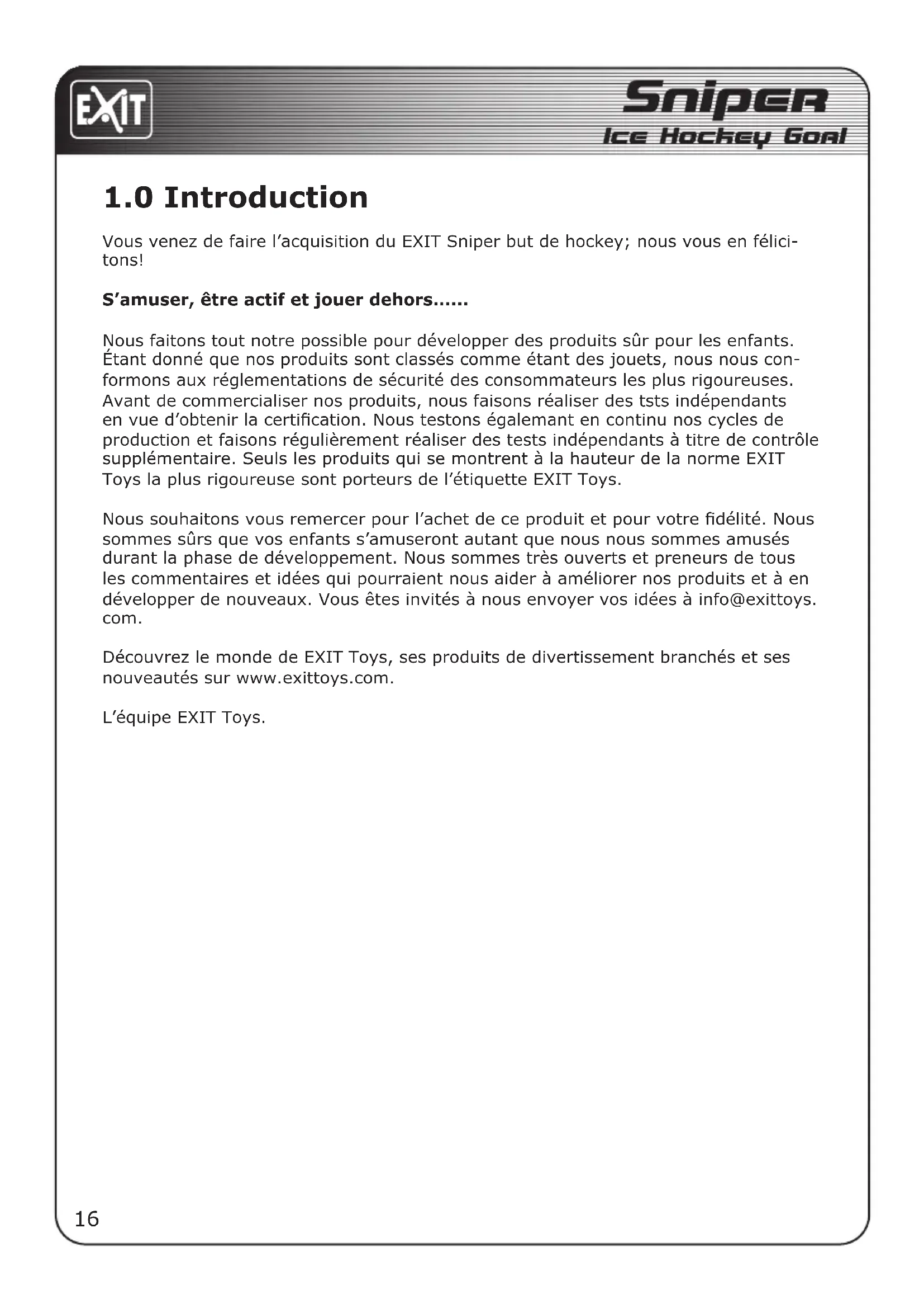 Nous souhaitons vous remercier pour l'achet de ce produit et pour votre fidélité. Nous sommes sûrs que vos enfants s'amuseront autant que nous nous sommes amusés durant la phase de développement. Nous sommes très ouverts et preneurs de tous les commentaires et idées qui pourraient nous aider à améliorer nos produits et à en développer de nouveaux. Vous êtes invités à nous envoyer vos idées à info@exittoys.com.