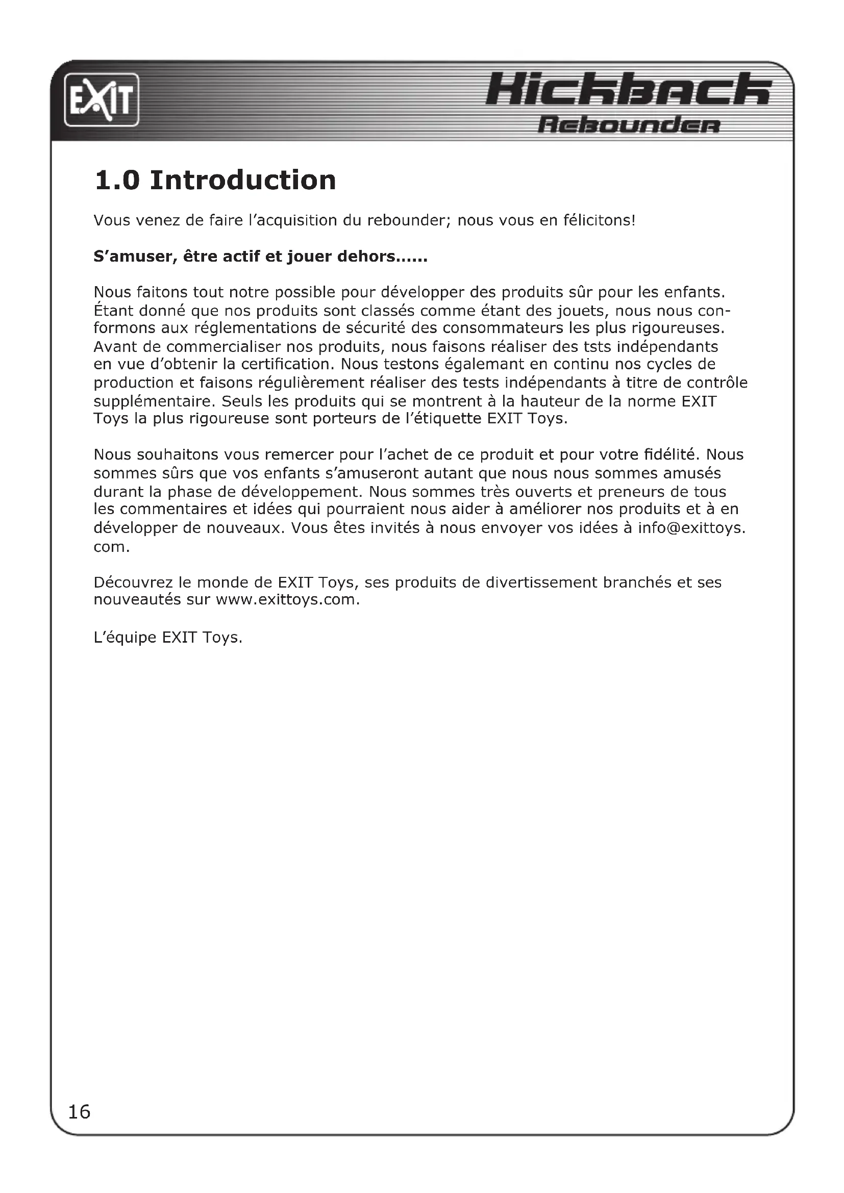 Nous souhaitons vous remercier pour l'achet de ce produit et pour votre fidélité. Nous sommes surs que vos enfants s'amuseront autant que nous nous sommesamusés durant la phase de développement. Nous sommes très ouverts et preneurs de tous les commentaires et idées qui pouraient nous aider à améliorer nos produits et à en développper de nouveaux. Vous étes invites à nous envoyer vos idées à info@exittoys. com.
