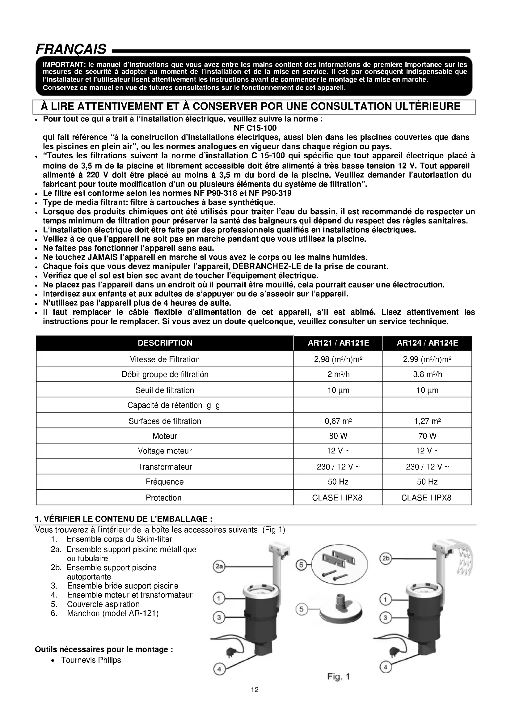 - Il faut remplacer le câble flexible d’alimentation de cet appareil, s’il est abîmé. Lisez attentivement les instructions pour le remplacer. Si vous avez un doute quelconque, veuillez consulter un service technique. DESCRIPTION AR121 / AR121E AR124 / AR124E Vitesse de Filtration 2,98 (m³/h)m² 2,99 (m³/h)m² Débit groupe de filtratión 2 m³/h 3,8 m³/h Seuil de filtration 10 µm 10 µm Capacité de rétention g g Surfaces de filtration 0,67 m² 1,27 m² Moteur 80 W 70 W Voltage moteur 12 V ~ 12 V ~ Transformateur 230 / 12 V ~ 230 / 12 V ~ Fréquence 50 Hz 50 Hz Protection CLASE I IPX8 CLASE I IPX8