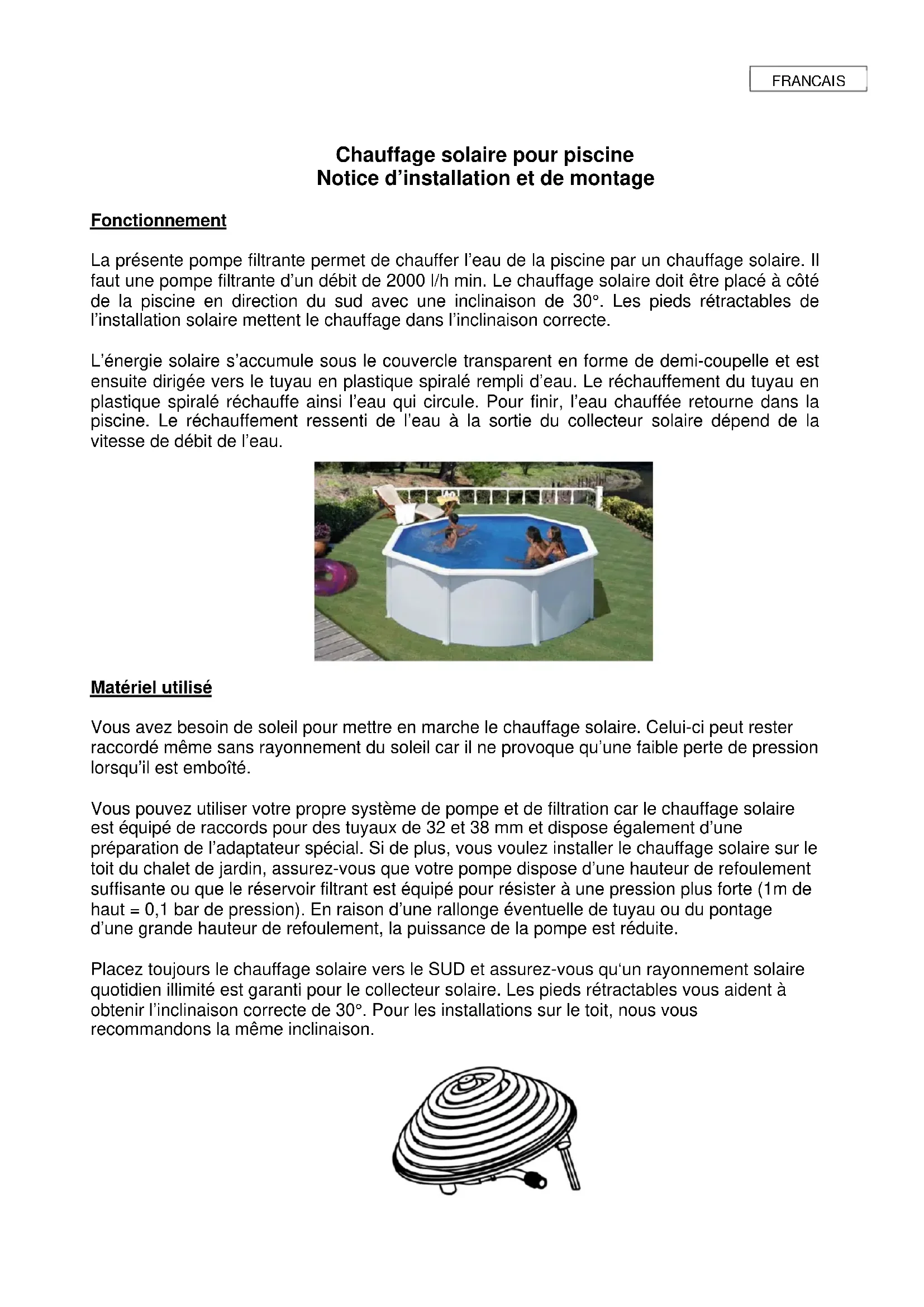 Protección para el invierno Para evitar problemas con el hielo, es necesario purgar el sistema totalmente durante el invierno. Guardar el calentador en un lugar seco y a salvo del hielo.Chauffage solaire pour piscine Notice d’installation et de montage Fonctionnement La présente pompe filtrante permet de chauffer l’eau de la piscine par un chauffage solaire. Il faut une pompe filtrante d’un débit de 2000 l/h min. Le chauffage solaire doit être placé à côté de la piscine en direction du sud avec une inclinaison de 30°. Les pieds rétractables de l’installation solaire mettent le chauffage dans l’inclinaison correcte. L’énergie solaire s’accumule sous le couvercle transparent en forme de demi-coupelle et est ensuite dirigée vers le tuyau en plastique spiralé rempli d’eau. Le réchauffement du tuyau en plastique spiralé réchauffe ainsi l’eau qui circule. Pour finir, l’eau chauffée retourne dans la piscine. Le réchauffement ressenti de l’eau à la sortie du collecteur solaire dépend de la vitesse de débit de l’eau.