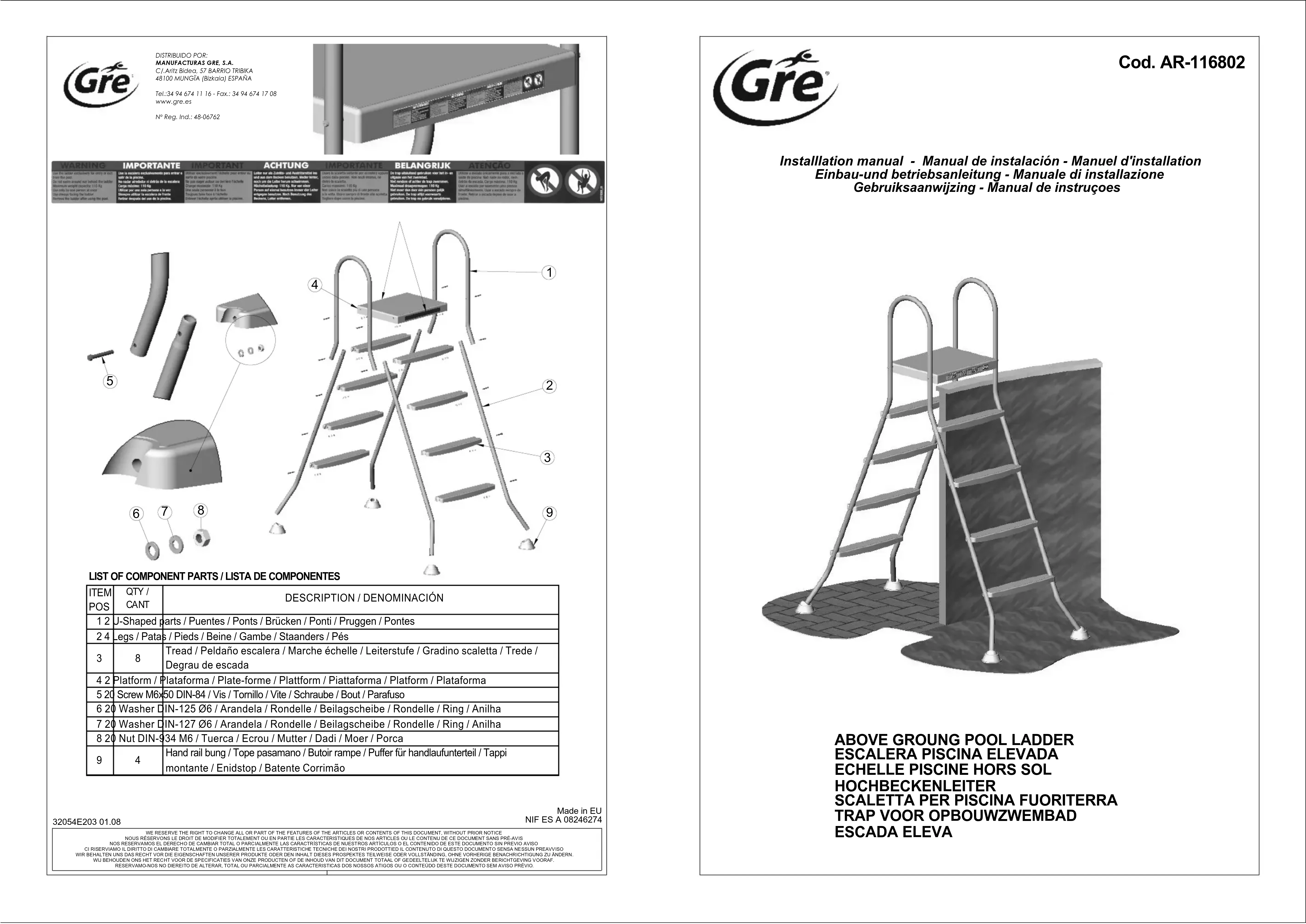 Très important: Tenez compte des instructions suivantes avant d´utiliser l´échelle. ● La charge maximale de cet escalier est de 110 Kg ● Monter l’escalier une seule personne à la fois. ● Vérifier l’état des composants de l’escalier avant d’en réaliser le montage et pendant son utilisation. ● Toujours monter ou descendre l’escalier de face. ● Ne pas plonger ni sauter de l’escalier. ● Il est recommandé de demontre et de nettoyer l’escalier pendant les périodes d’hiver pour mieux le conserver. ● Ne pas s’asseoir sur l’escalier. ● Ne pas permettre aux enfants d’utiliser l’escalier sans surveillance. ● Lire attentivement les instructions d’entretien pour l’acier inoxydable qui sont jointes à ce manuell. ● Lire attentivement les instructions de montage. ● Conserver ces instructions pour pouvoir les consulter, en cas de besoin Cet escalier étant facile à monter, il peut être monté par une seule personne adulte et dans une période de temps d'environ 1 HEURE. Seuls les outils suivants sont nécessaires : Tournevis plat - Clé fixe de 10 mm. A. Emboîter les ponts (1) dans les pieds (2), puis les assembler aux marches supérieures (3), en les fixant au moyen des vis (5), des rondelles (6 et 7) et des écrous (8) sans les serrer trop fort. B. Assembler les autres marches (3) et les pieds (2), puis la plate-forme (4) et les ponts (1), en les fixant à l’aide des vis (5), des rondelles (6 et 7) et des écrous (8). Bien serrer tous les écrous. C. Finalement, placer les patins de l’escalier (9).