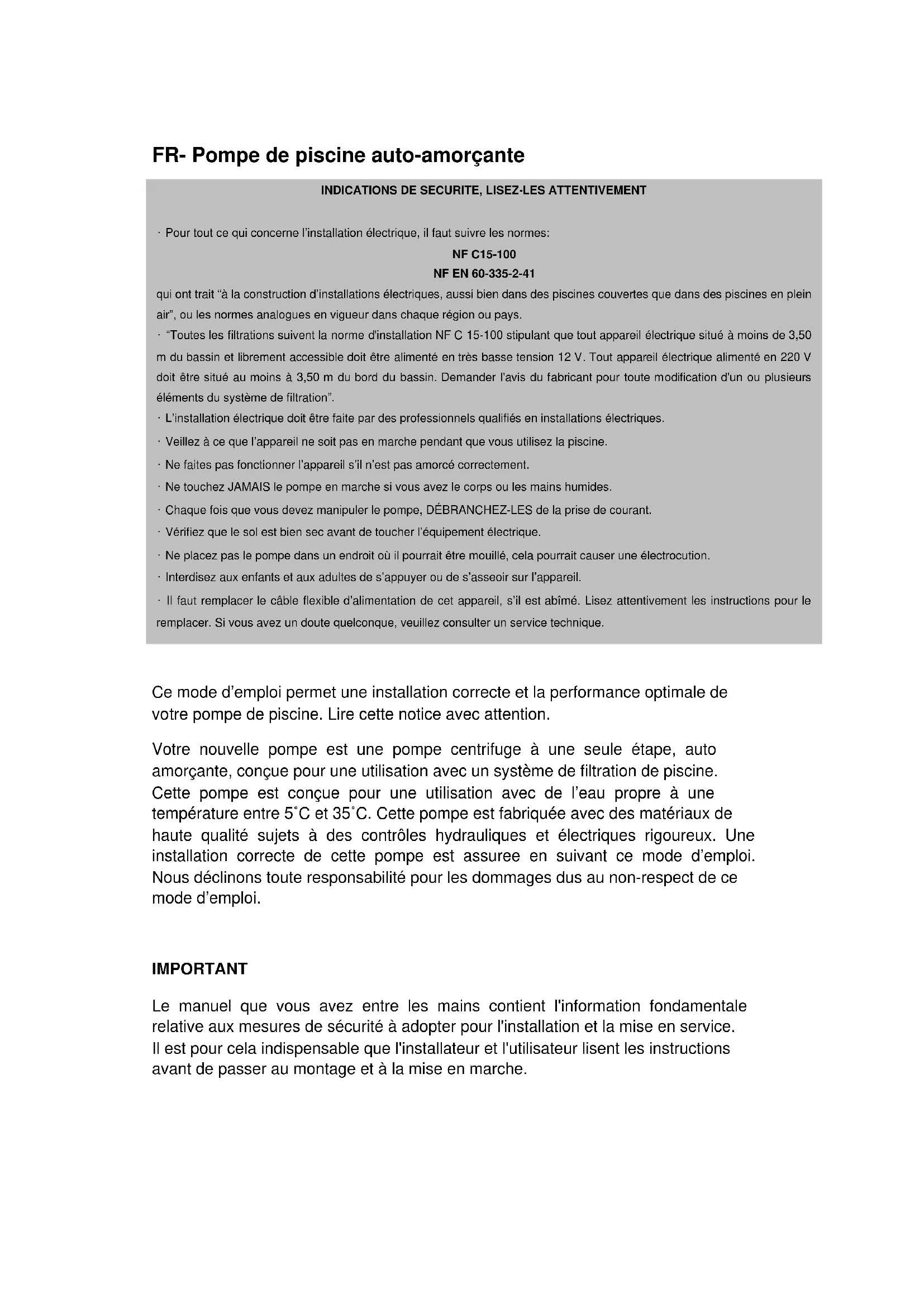 tre pompe de piscine. Lire cette notice avec attention. Votre nouvelle pompe est une pompe centrifuge à une seule étape, auto amorçante, conçue pour une utilisation avec un système de filtration de piscine. Cette pompe est conçue pour une utilisation avec de l’eau propre à une température entre 5˚C et 35˚C. Cette pompe est fabriquée avec des matériaux de haute qualité sujets à des contrôles hydrauliques et électriques rigoureux. Une installation correcte de cette pompe est assuree en suivant ce mode d’emploi. Nous déclinons toute responsabilité pour les dommages dus au non-respect de ce mode d’emploi. IMPORTANT Le manuel que vous avez entre les mains contient l'information fondamentale relative aux mesures de sécurité à adopter pour l'installation et la mise en service. Il est pour cela indispensable que l'installateur et l'utilisateur lisent les instructions avant de passer au montage et à la mise en marche.