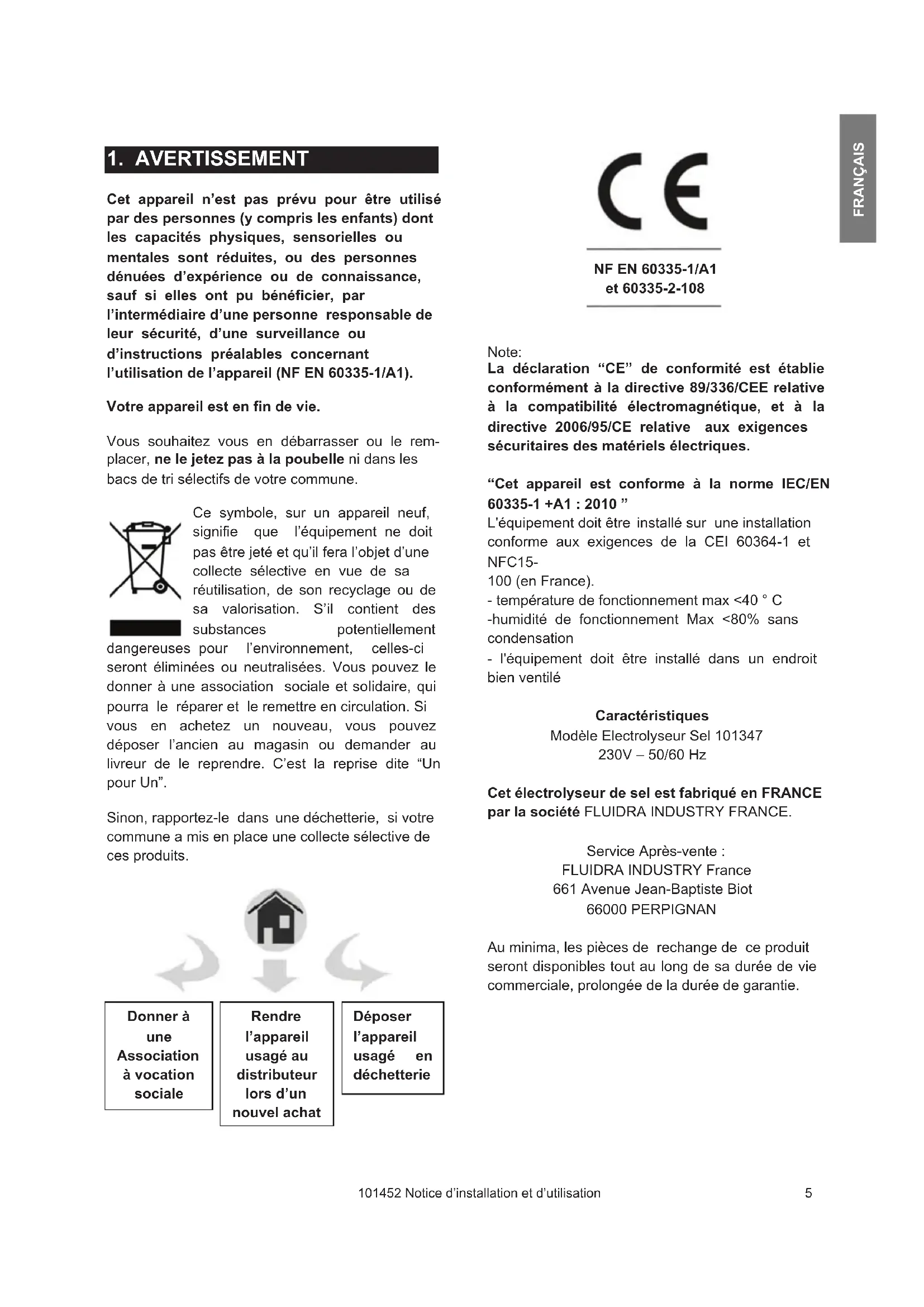 Cet appareil n’est pas prévu pour être utilisé par des personnes (y compris les enfants) dont les capacités physiques, sensorielles ou mentales sont réduites, ou des personnes dénuées d’expérience ou de connaissance, sauf si elles ont pu bénéficier, par l’intermédiaire d’une personne responsable de leur sécurité, d’une surveillance ou d’instructions préalables concernant l’utilisation de l’appareil (NF EN 60335-1/A1). Votre appareil est en fin de vie. Vous souhaitez vous en débarrasser ou le rem- placer, ne le jetez pas à la poubelle ni dans les bacs de tri sélectifs de votre commune. Ce symbole, sur un appareil neuf, signifie que l’équipement ne doit pas être jeté et qu’il fera l’objet d’une collecte sélective en vue de sa réutilisation, de son recyclage ou de sa valorisation. S’il contient des substances potentiellement dangereuses pour l’environnement, celles-ci seront éliminées ou neutralisées. Vous pouvez le donner à une association sociale et solidaire, qui pourra le réparer et le remettre en circulation. Si vous en achetez un nouveau, vous pouvez déposer l’ancien au magasin ou demander au livreur de le reprendre. C’est la reprise dite “Un pour Un”. Sinon, rapportez-le dans une déchetterie, si votre commune a mis en place une collecte sélective de ces produits. Note: La déclaration “CE” de conformité est établie conformément à la directive 89/336/CEE relative à la compatibilité électromagnétique, et à la directive 2006/95/CE relative aux exigences sécuritaires des matériels électriques. “Cet appareil est conforme à la norme IEC/EN 60335-1 +A1 : 2010 ” L'équipement doit être installé sur une installation conforme aux exigences de la CEI 60364-1 et NFC15- 100 (en France). - température de fonctionnement max <40 ° C -humidité de fonctionnement Max <80% sans condensation - l'équipement doit être installé dans un endroit bien ventilé Caractéristiques Modèle Electrolyseur Sel 101347 230V – 50/60 Hz Cet électrolyseur de sel est fabriqué en FRANCE par la société FLUIDRA INDUSTRY FRANCE. Service Après-vente : FLUIDRA INDUSTRY France 661 Avenue Jean-Baptiste Biot 66000 PERPIGNAN Au minima, les pièces de rechange de ce produit seront disponibles tout au long de sa durée de vie commerciale, prolongée de la durée de garantie. Donner à une Association à vocation sociale Rendre l’appareil usagé au distributeur lors d’un nouvel achat Déposer l’appareil usagé en déchetterie NF EN 60335-1/A1 et 60335-2-108101452 Notice d’installation et d’utilisation 6 FRANÇAIS