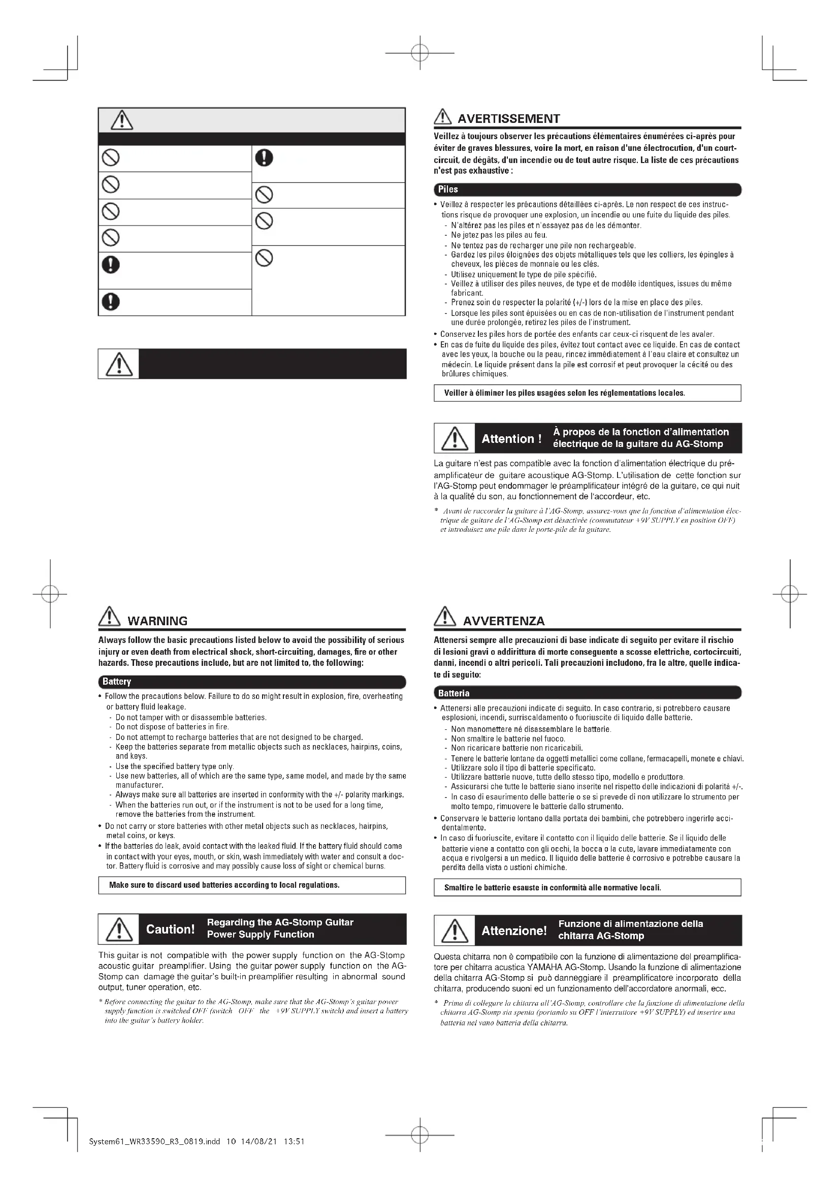 La guitare n'est pas compatible avec la fonction d'alimentation électrique du préamplificateur de guitare acoustique AG-Stomp. L'utilisation de cette fonction sur l'AG-Stomp peut endommager le préamplificateur intégré de la guitare, ce qui nuit à la qualité du son, au fonctionnement de l'accordeur, etc.
