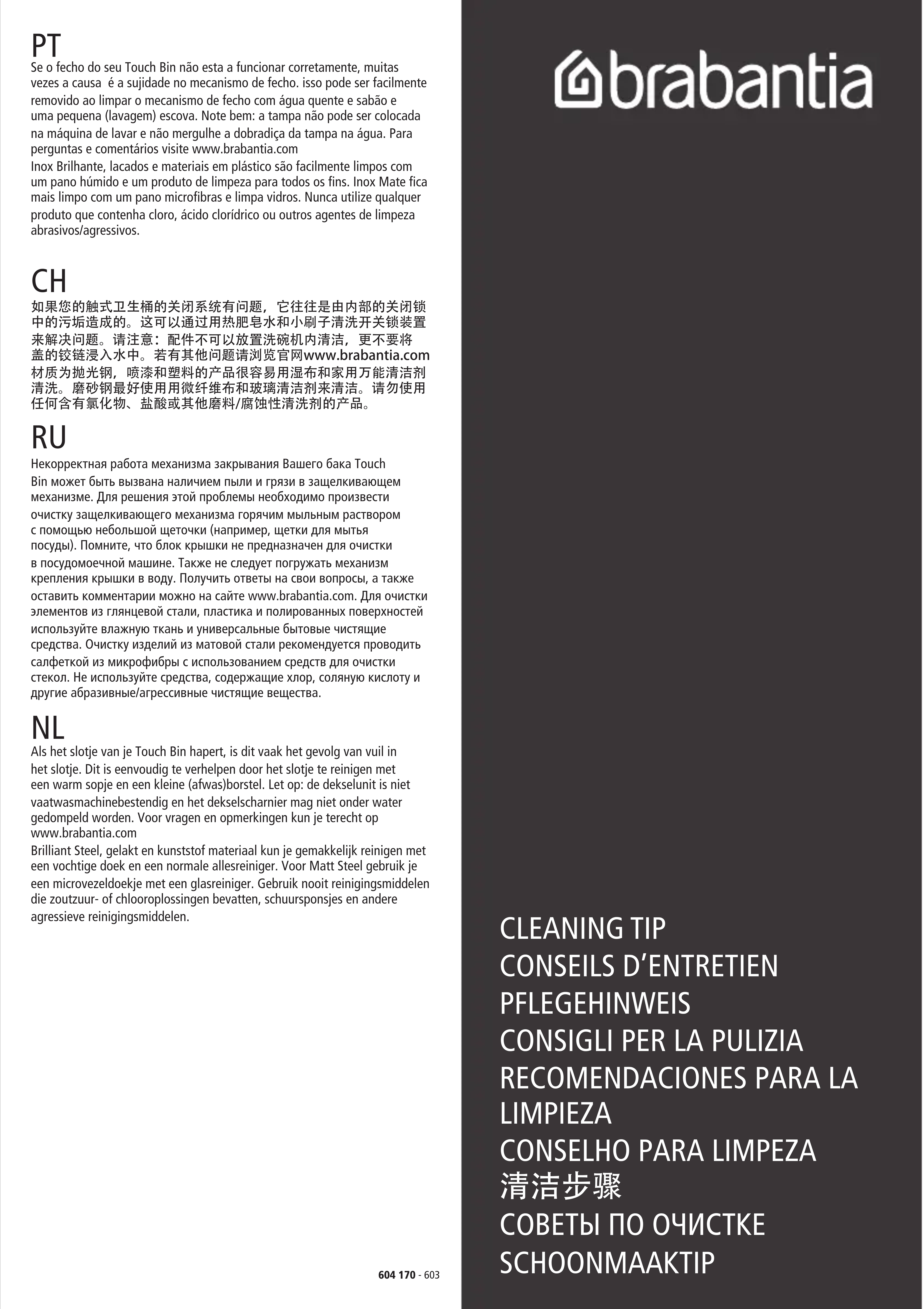 Si votre Touch Bin ne ferme pas de manière optimale, c'est généralement parce que de la saleté est présente dans le système de fermeture. Celle-ci peut être facilement retirée en nettoyant le système de fermeture à l'eau chaude savonneuse, à l'aide d'une petite brosse (à vaisselle). Remarque : le dispositif de couvercle ne peut pas être placé au lave-vaisselle et la charnière du couvercle ne peut pas être immergée dans l'eau. Pour toutes questions et remarques, veuillez consulter www.brabantia.com Les matières plastiques, laquées et acier brillant se nettoient facilement à l'aide d'un chiffon humide et d'un nettoyant ménager multi-usage. L'acier brossé se nettoie de préférence à l'aide d'un chiffon en microfibre et d'un nettoyant pour vitres. N'utilisez jamais de produit qui contient du chlorure, de l'acide chlorhydrique ou d'autres agents de nettoyage abrasifs ou agressifs.