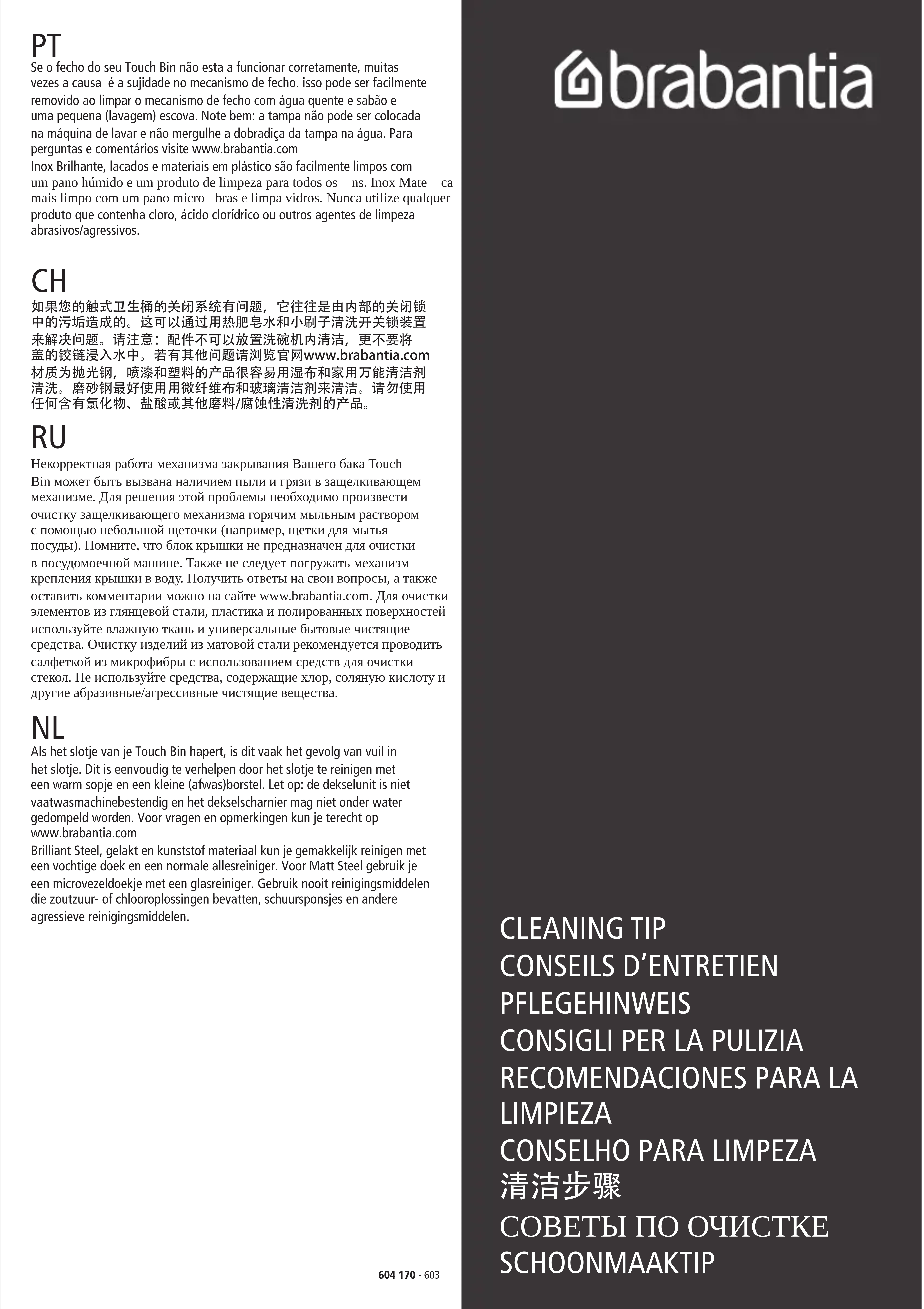 Retrouvez gratuitement la notice de l'appareil Touch Bin 111709 BRABANTIA au format PDF.