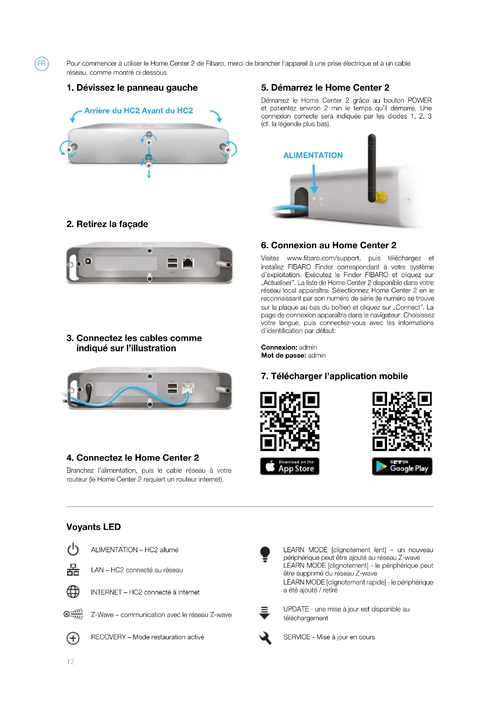 ALIMENTATION Visitez www.fibaro.com/support, puis téléchargez et installez FIBARO Finder correspondant à votre système d’exploitation. Exécutez le Finder FIBARO et cliquez sur „Actualiser”. La liste de Home Center 2 disponible dans votre réseau local apparaîtra. Sélectionnez Home Center 2 en le reconnaissant par son numéro de série (le numéro se trouve sur la plaque au bas du boîtier) et cliquez sur „Connect”. La page de connexion apparaîtra dans le navigateur. Choisissez votre langue, puis connectez-vous avec les informations d’identification par défaut: Connexion: admin Mot de passe: admin
