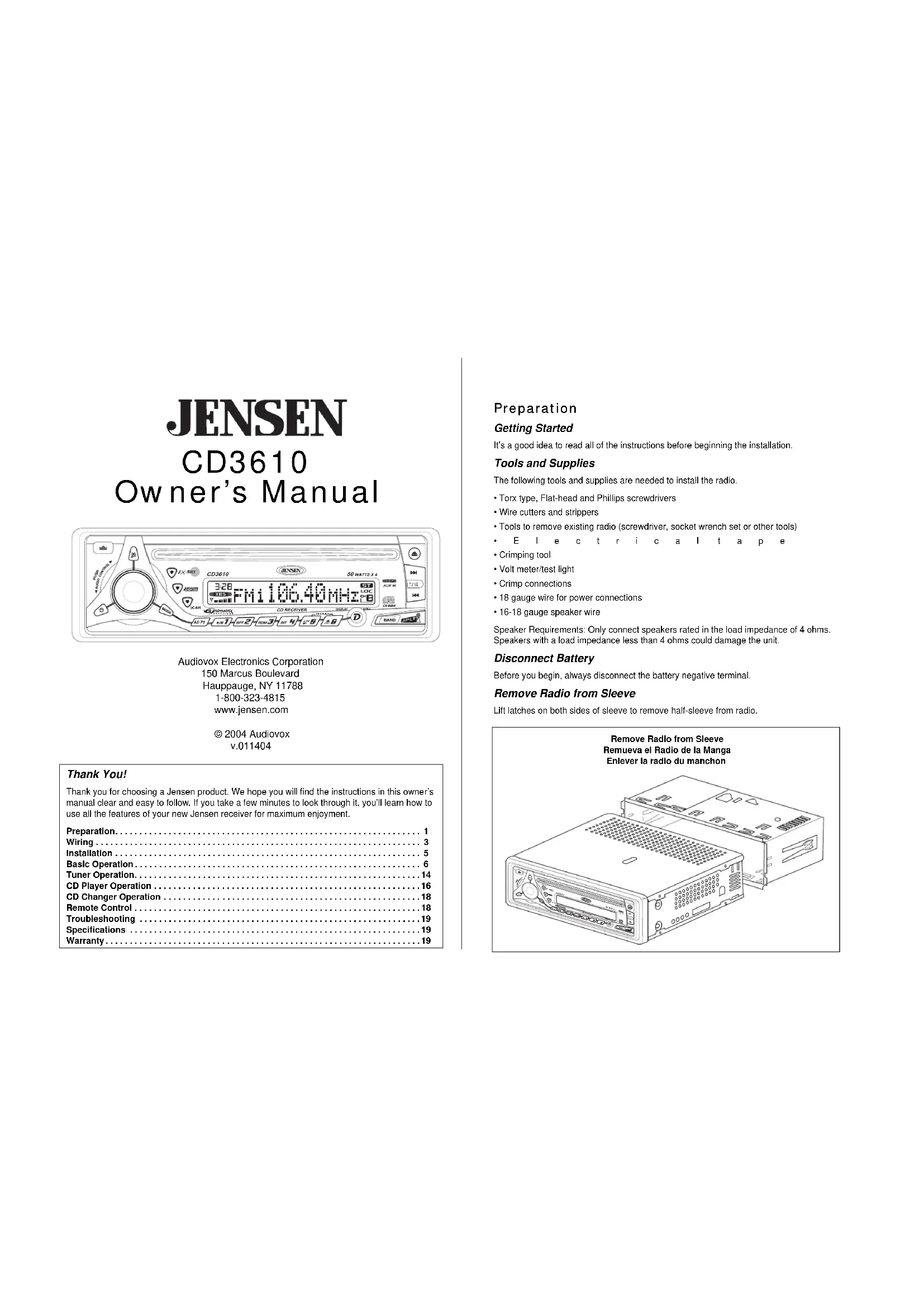 Téléchargez la notice de votre Autoradio au format PDF gratuitement ! Retrouvez votre notice CD3610 - JENSEN et reprennez votre appareil électronique en main. Sur cette page sont publiés tous les documents nécessaires à l'utilisation de votre appareil CD3610 de la marque JENSEN.