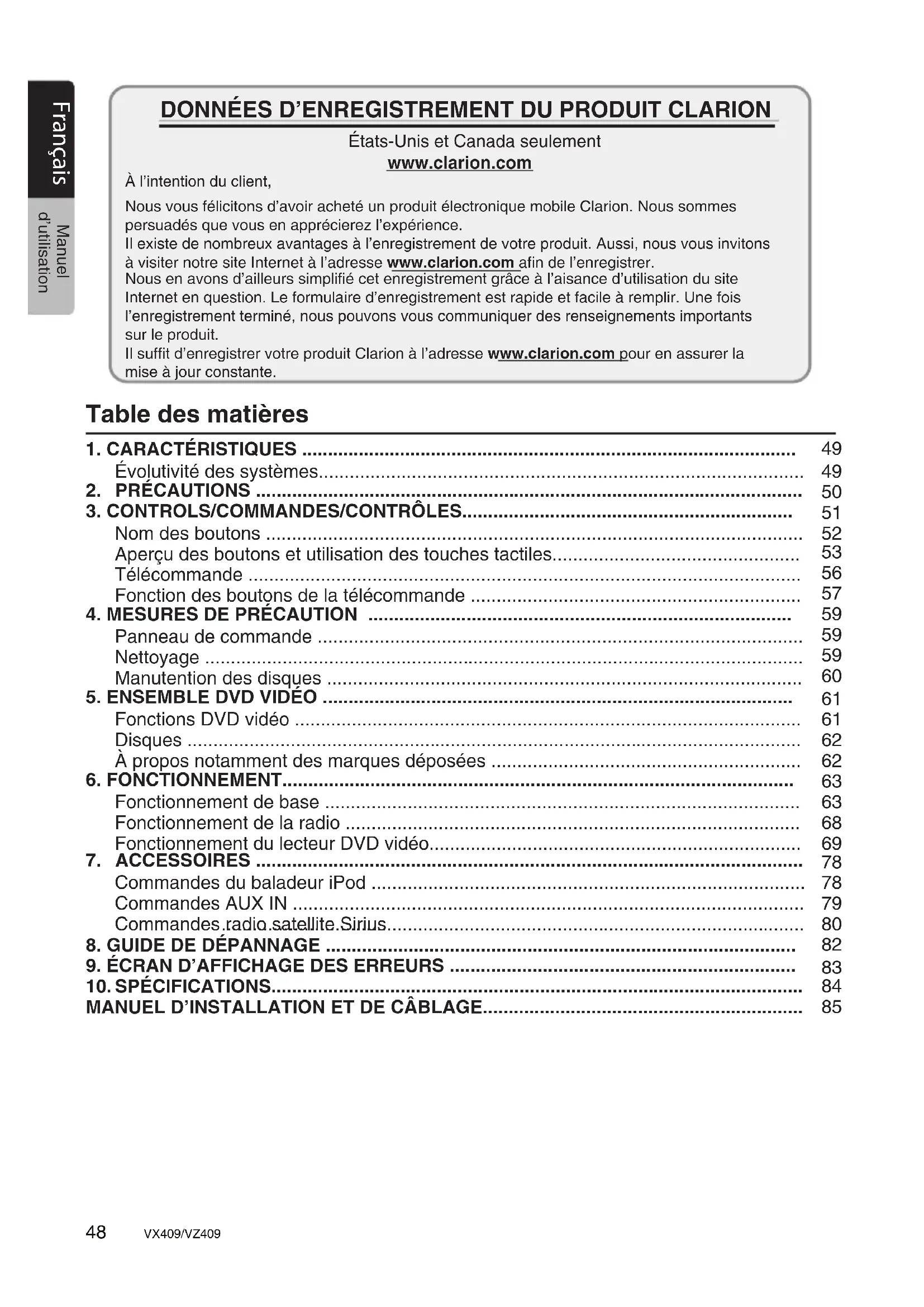 10. SPÉCIFICATIONS....................................................................................................... MANUEL D’INSTALLATION ET DE CÂBLAGE.............................................................. DONNÉES D’ENREGISTREMENT DU PRODUIT CLARION États-Unis et Canada seulement www.clarion.com À l’intention du client,Nous vous félicitons d’avoir acheté un produit électronique mobile Clarion. Nous sommes persuadés que vous en apprécierez l’expérience.Il existe de nombreux avantages à l’enregistrement de votre produit. Aussi, nous vous invitons à visiter notre site Internet à l’adresse www.clarion.com afin de l’enregistrer.Nous en avons d’ailleurs simplifié cet enregistrement grâce à l’aisance d’utilisation du site Internet en question. Le formulaire d’enregistrement est rapide et facile à remplir. Une fois l’enregistrement terminé, nous pouvons vous communiquer des renseignements importants sur le produit.Il suffit d’enregistrer votre produit Clarion à l’adresse www.clarion.com pour en assurer la mise à jour constante.