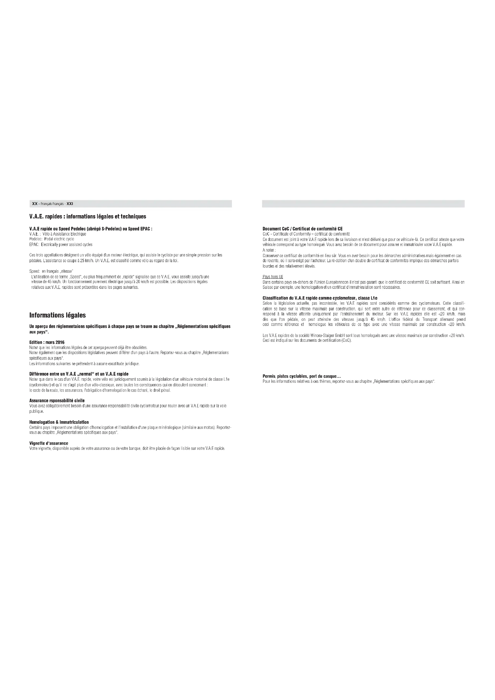 L'utilisation de ce terme „Speed“, ou plus fréquemment de „rapide“ signalise que ce V.A.E. vous assisle jusqu'à une vitesse de 45 km/h. Un fonctionnement purement électrique jusqu'à 20 km/h est possible. Les dispositions légales relatives aux V.A.E. rapides sont présentées dans les pages suivantes.