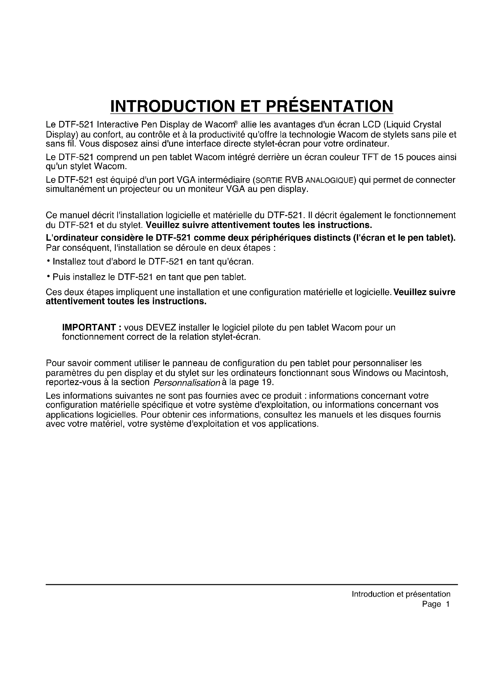 allie les avantages d'un écran LCD (Liquid Crystal Display) au confort, au contrôle et à la productivité qu'offre la technologie Wacom de stylets sans pile et sans fil. Vous disposez ainsi d'une interface directe stylet-écran pour votre ordinateur. Le DTF-521 comprend un pen tablet Wacom intégré derrière un écran couleur TFT de 15 pouces ainsi qu'un stylet Wacom. Le DTF-521 est équipé d'un port VGA intermédiaire ( SORTIE RVB ANALOGIQUE) qui permet de connecter simultanément un projecteur ou un moniteur VGA au pen display. Ce manuel décrit l'installation logicielle et matérielle du DTF-521. Il décrit également le fonctionnement du DTF-521 et du stylet. Veuillez suivre attentivement toutes les instructions. L'ordinateur considère le DTF-521 comme deux périphériques distincts (l'écran et le pen tablet). Par conséquent, l'installation se déroule en deux étapes :