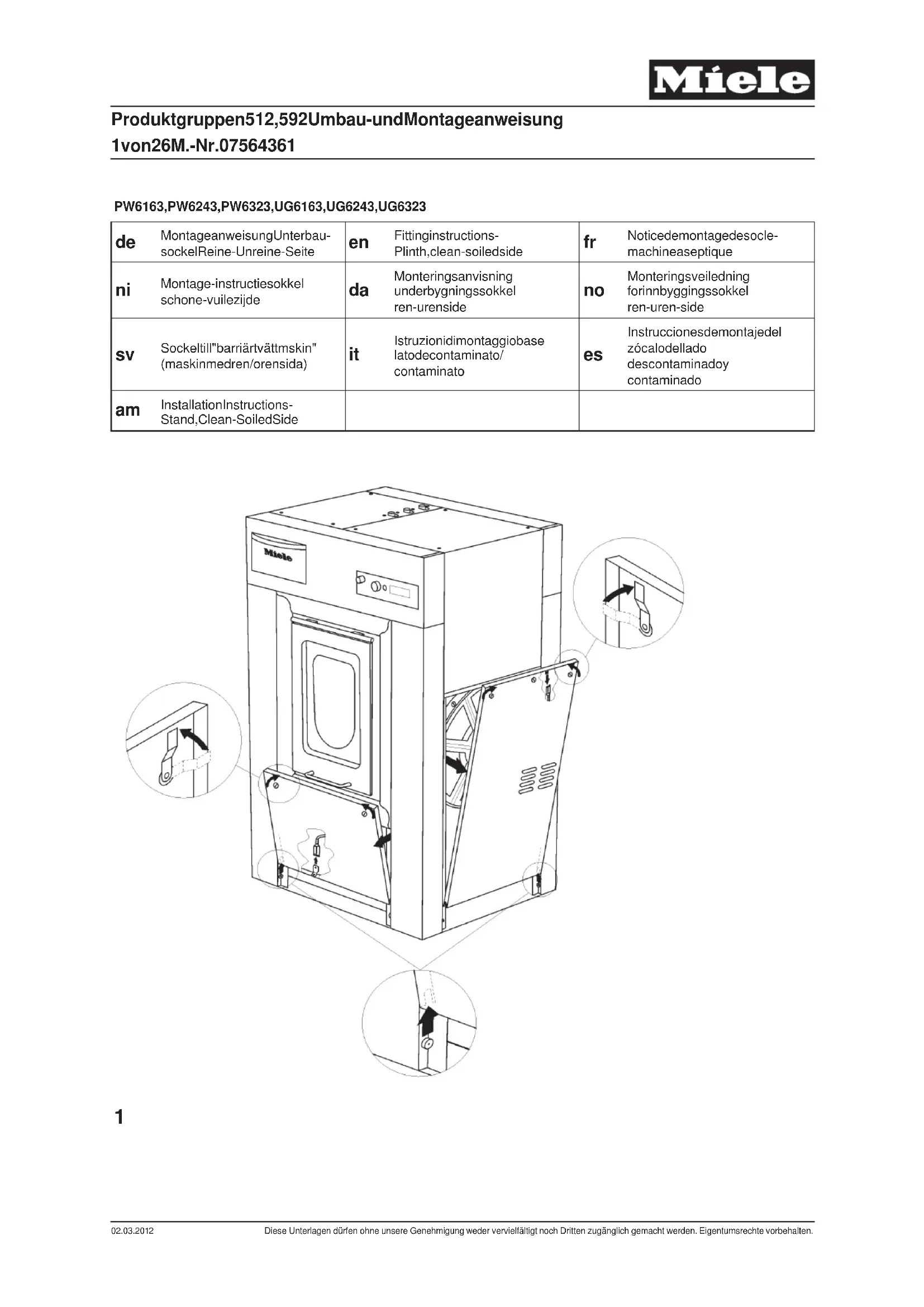 Nombre Mat.-Nr. Désignation 1 07493360 Jeu de montage du socle UG 6163 octobleu pour PW 6163 1 07493370 Jeu de montage du socle UG 6163 inox pour PW 6163 1 07493380 Jeu de montage du socle UG 6243 octobleu pour PW 6243 1 07493390 Jeu de montage du socle UG 6243 inox pour PW 6243 1 07493400 Jeu de montage du socle UG 6323 octobleu pour PW 6323 1 07493410 Jeu de montage du socle UG 6323 inox pour PW 6323 1 06585110 Tuyau HTEM DN 75x250 - rallonge de la vidange au sol de minimum 170 mm Produktgruppen 512, 592 Umbau- und Montageanweisung 7 von 26 M.-Nr. 07564361 02.03.2012 Diese Unterlagen dürfen ohne unsere Genehmigung weder vervielfältigt noch Dritten zugänglich gemacht werden. Eigentumsrechte vorbehalten.Remarque Ces travaux d'adaptation doivent être effectués exclusivement par un technicien qualifié (c'est à dire ayant suivi une formation spécifique et disposant de connaissances et d'expériences récentes dans le domaine) respectant les prescriptions de sécurité en vigueur. La réglementation en vigueur, les prescriptions de prévention des accidents, les normes applicables de sécurité sur le lieu d'installation ainsi que les prescriptions de la compagnie d'électricité doivent impérativement être respectées pour la réparation, la modification, le contrôle et la maintenance des appareils électriques. Danger ! Même si l'appareil est déconnecté, les composants peuvent présenter une tension résiduelle. C'est pourquoi avant d'effectuer tout entretien, réparation ou modification, il est nécessaire de débrancher tous les câbles actifs et sous tension et d'effectuer une mesure pour s'assurer de l'absence de tension résiduelle ! Un contrôle visuel général doit impérativement être effectué. Si le montage n'est pas effectué correctement, il peut causer un incendie. Danger ! Risque de blessure lors du montage