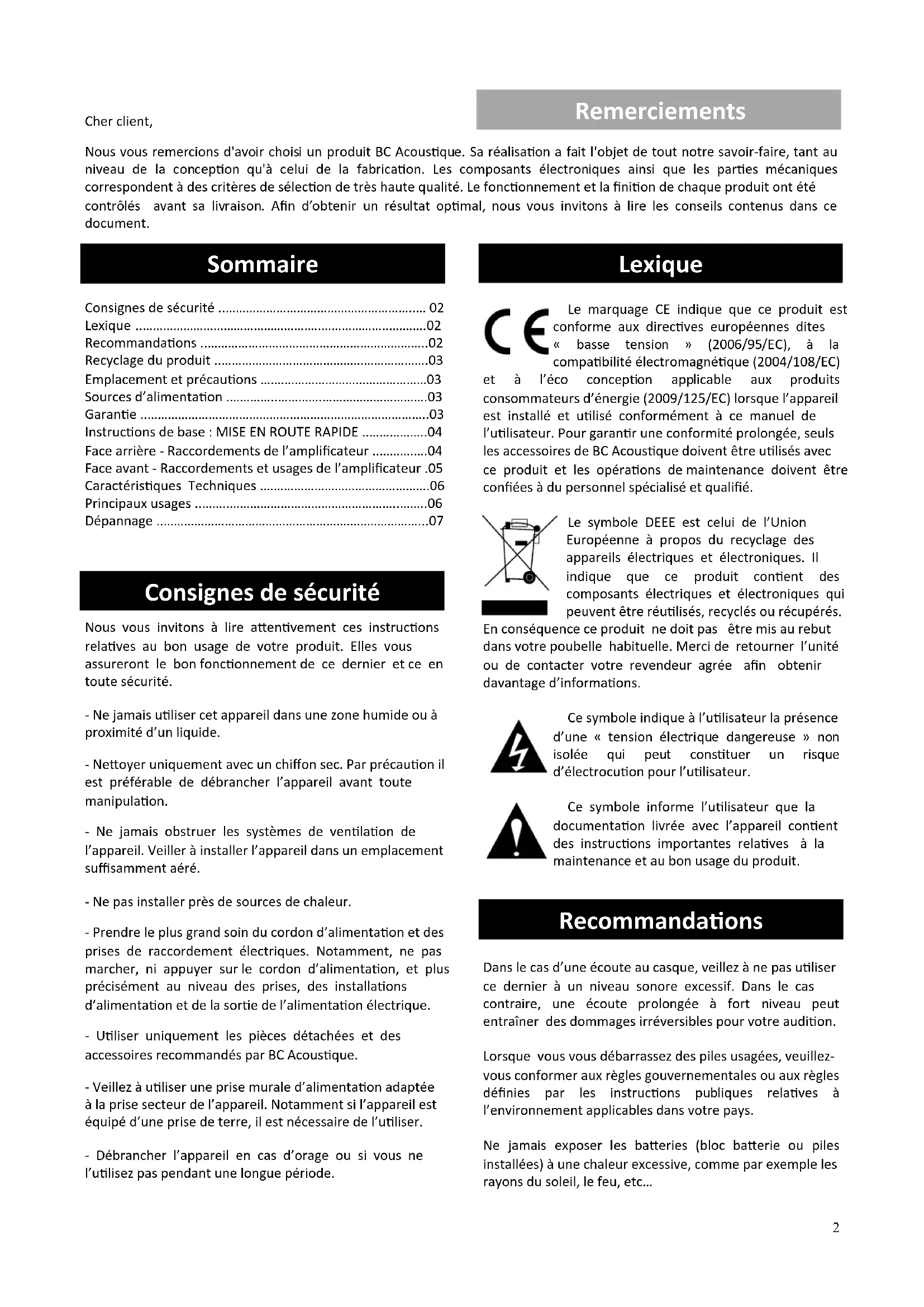 Nous vous remercions d'avoir choisi un produit BC Acoustique. Sa réalisation a fait l'objet de tout notre savoir-faire, tant au niveau de la conception qu'a celui de la fabrication. Les composants électroniques ainsi que les parties mécaniques correspondant à des critères de selection de très haute qualité. Le fonctionnement et la finition de chaque produit ont été contrôlés avant sa livraison. Afin d'obtenir un résultat optimal, nous vous invitons à dire les conseils contenus dans ce document.