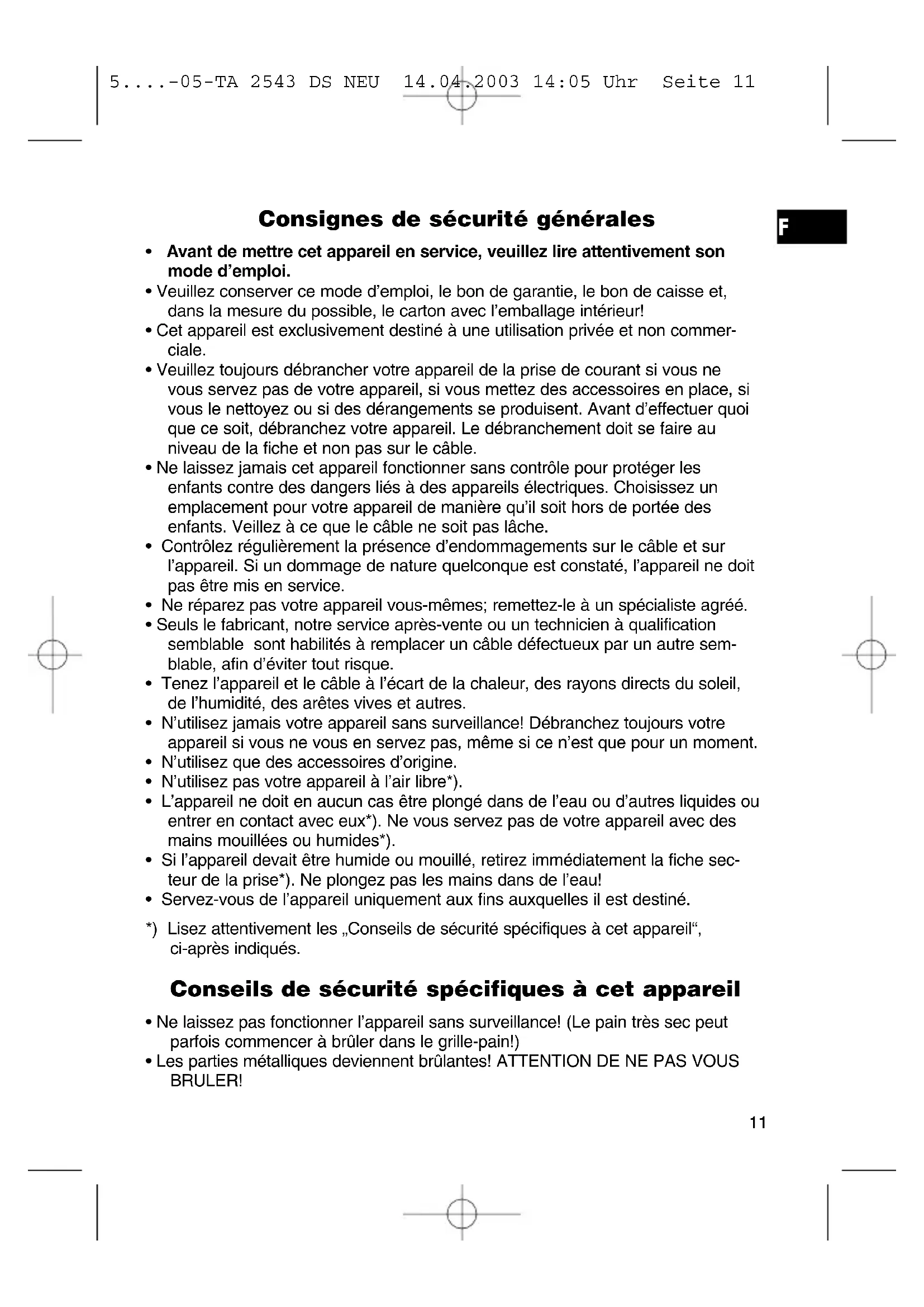 5....-05-TA 2543 DS NEU 14.04.2003 14:05 Uhr Seite 11• N'introduisez jamais de fourchettes, couteaux ou tout autre objet dans le grille-pain!
