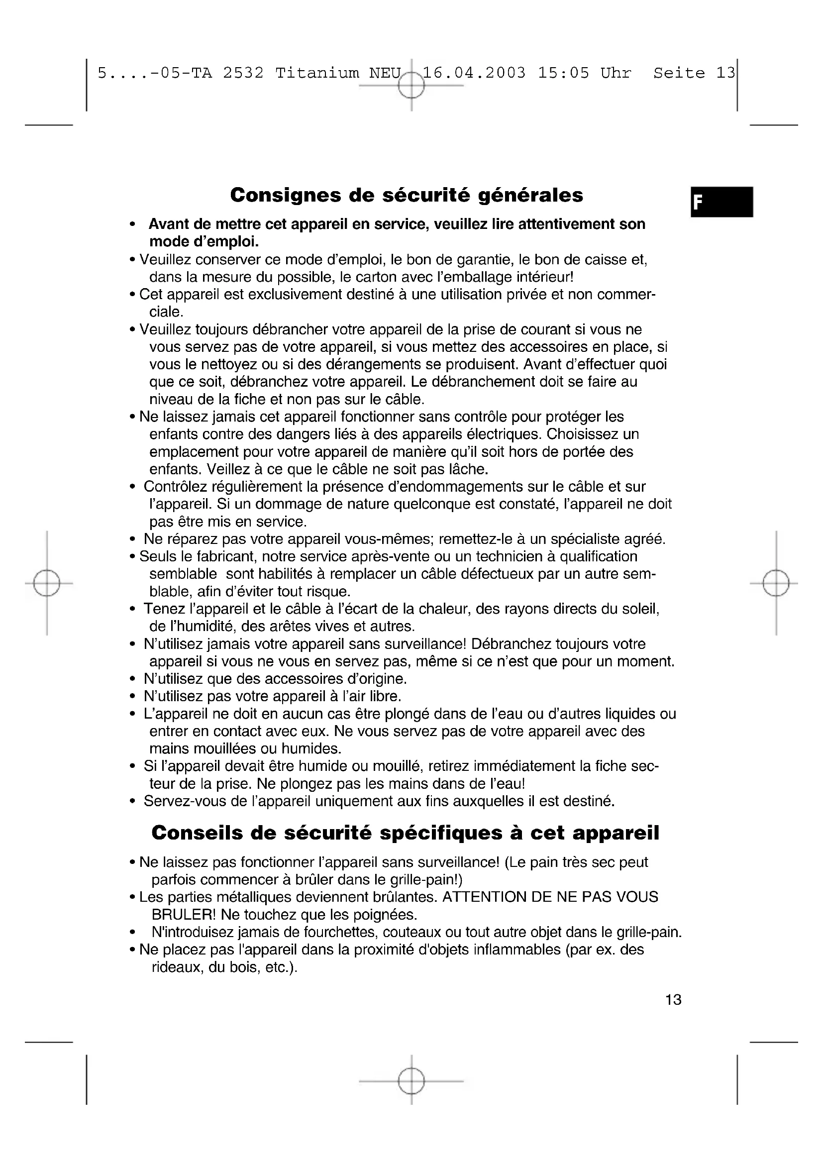 5....-05-TA 2532 Titanium NEU 16.04.2003 15:05 Uhr Seite 14• Sortez le tiroir à miettes (au dos de l’appareil) ), retirez les restes de pain et repla- cez le tiroir à sa place. Cet appareil satisfait aux directives CE pour l'antiparasitage et pour la sécurité basse tension et a été conçu selon les toutes récentes prescriptions techniques de sécurité. Sous réserve de modifications techniques. Garantie Nous fournissons une garantie de 24 mois à partir de la date d’achat (ticket de caisse) pour tous les appareils de notre marque. Nous assurons les réparations ou le remplacement des appareils pour toutes les pannes et tous les défauts de matériau ou de fabrication, apparus pendant la durée de la garantie. Le ticket de caisse est votre certificat de garantie. Sans cette preuve d’achat, aucun remplacement ni aucune réparation ne seront faits gratuitement. Si vous devez avoir recours à la garantie, rapportez tout votre appareil dans l’em- ballage original avec le ticket de caisse à votre vendeur. Les débris de verre et le mauvais fonctionnement des accessoires ne peuvent justi- fier le remplacement de tout l’appareil mais seront remplacés individuellement et gratuitement. Il n’est donc pas nécessaire, dans ce cas, de renvoyer tout l’appareil. Il vous suffit de commander les accessoires défectueux ! Le nettoyage, la maintenance et le remplacement des pièces résistantes à l’usure ne font pas partie de la garantie et ne sont donc pas proposés gratuitement. La garantie est annulée lorsque l’appareil est utilisée par une tierce personne. Après la garantie Après expiration de la garantie, les réparations peuvent être effectuées, moyennant paiement, par des commerces spécialisés ou des services de réparations qualifiés.