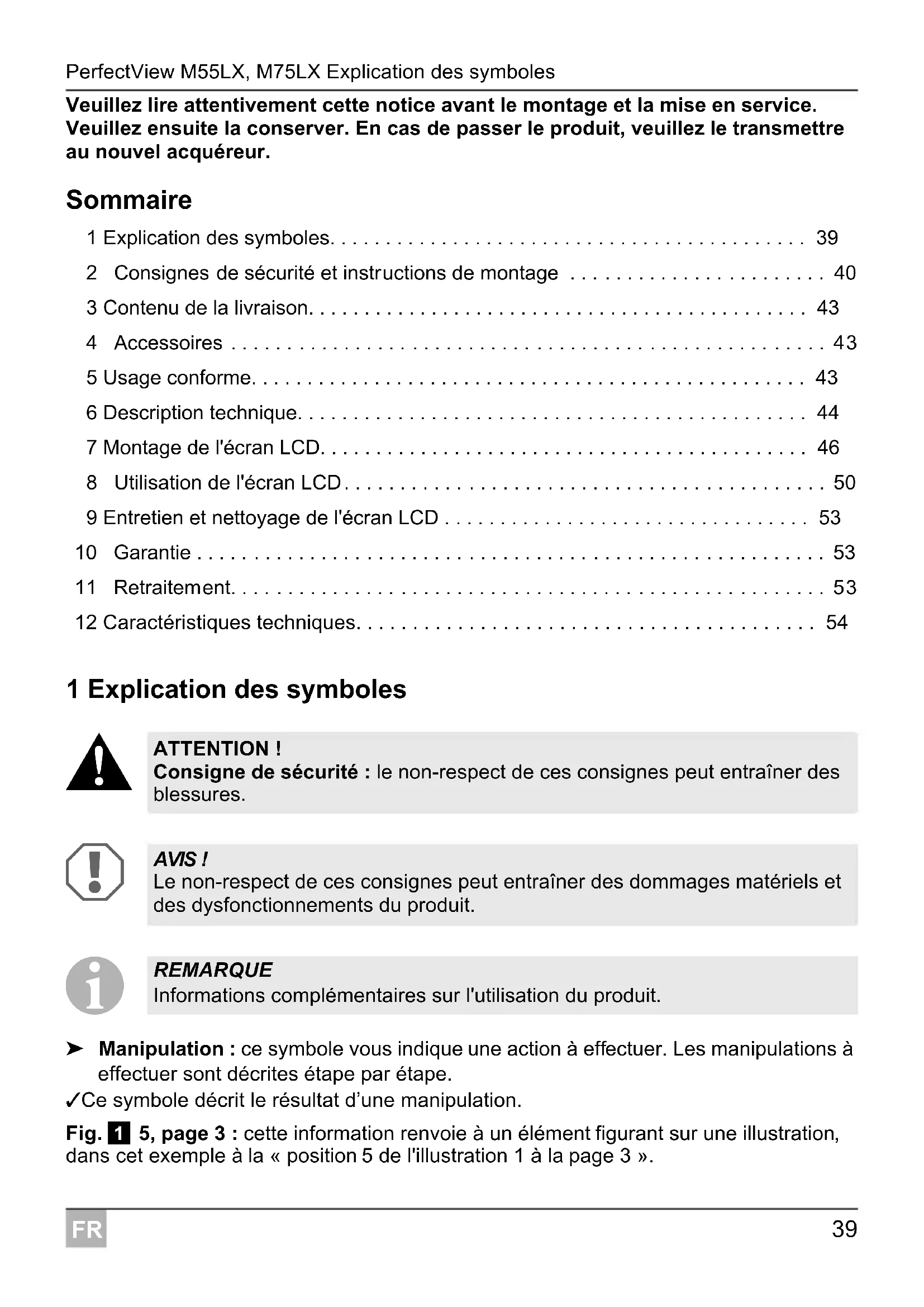 ➤ Manipulation : ce symbole vous indique une action à effectuer. Les manipulations à effectuer sont décrites étape par étape. ✓ Ce symbole décrit le résultat d’une manipulation. Fig. 1 5, page 3 : cette information renvoie à un élément figurant sur une illustration, dans cet exemple à la « position 5 de l'illustration 1 à la page 3 ». ATTENTION ! Consigne de sécurité : le non-respect de ces consignes peut entraîner des blessures. AVIS ! Le non-respect de ces consignes peut entraîner des dommages matériels et des dysfonctionnements du produit. REMARQUE Informations complémentaires sur l'utilisation du produit.Consignes de sécurité et instructions de montage PerfectView M55LX, M75LX