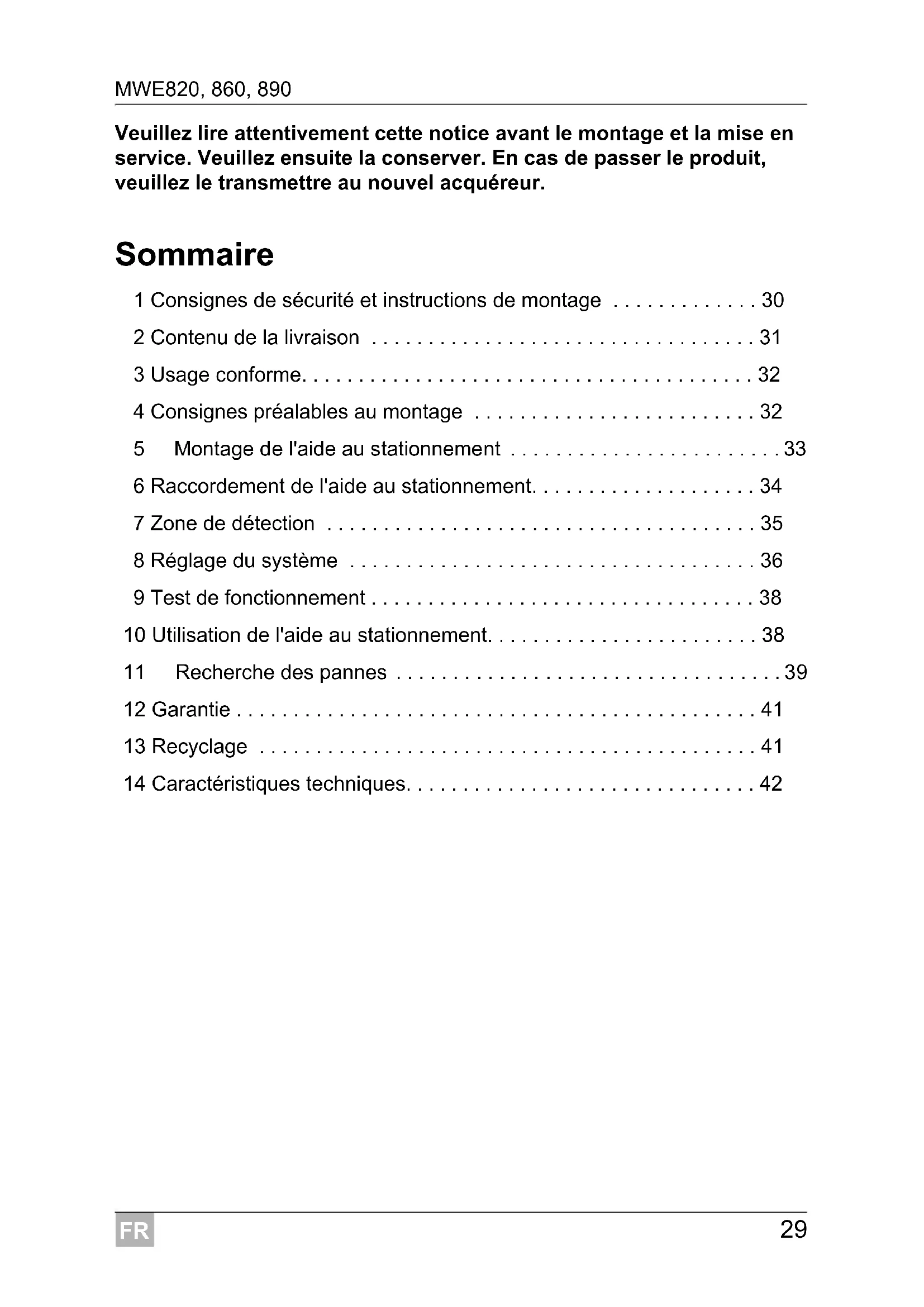- 14 Caractéristiques techniques FR Consignes de sécurité et instructions de montage MWE820, 860, 890 p. 42