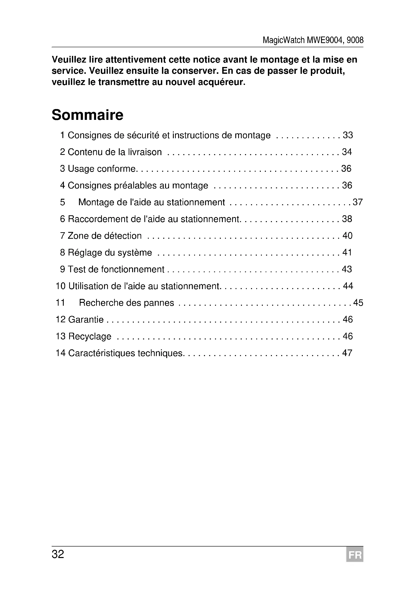 - 14 Caractéristiques techniques FR MagicWatch MWE9004, 9008 Consignes de sécurité et instructions de montage p. 47