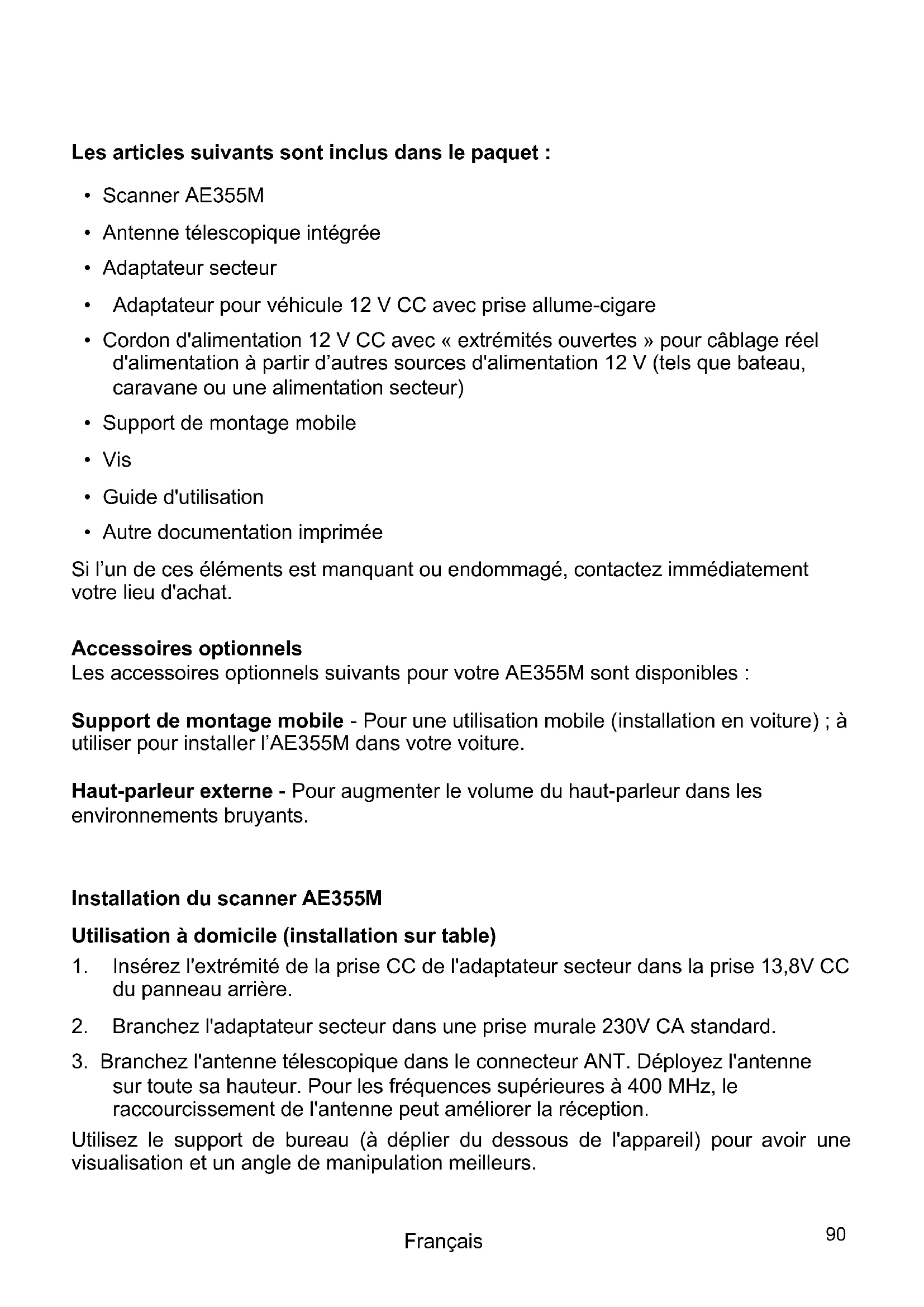 - Autre documentation imprimée Si l’un de ces éléments est manquant ou endommagé, contactez immédiatement votre lieu d'achat. Accessoires optionnels Les accessoires optionnels suivants pour votre AE355M sont disponibles : Support de montage mobile - Pour une utilisation mobile (installation en voiture) ; à utiliser pour installer l’AE355M dans votre voiture. Haut-parleur externe - Pour augmenter le volume du haut-parleur dans les environnements bruyants. Installation du scanner AE355M Utilisation à domicile (installation sur table)