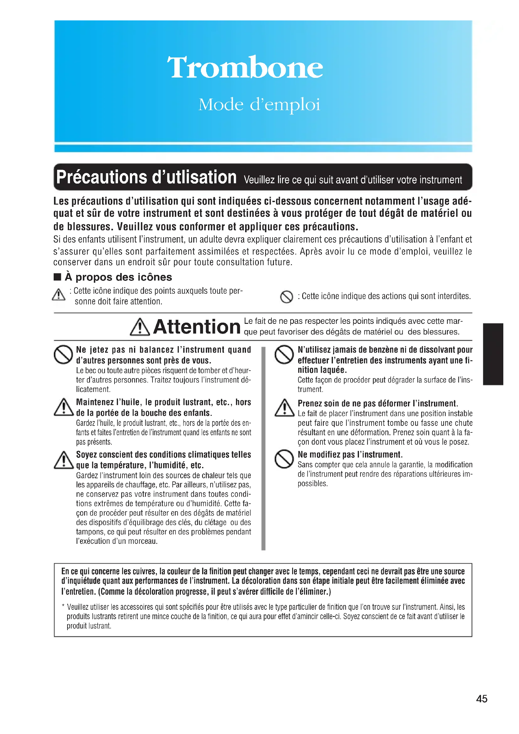 Trombone_om_cover_080708.indd 2 08.7.8 10:40:36 AM45 Trombone Mode d’emploi Précautions d’utlisation Veuillez lire ce qui suit avant d’utiliser votre instrument Ne jetez pas ni balancez l’instrument quandd’autres personnes sont près de vous.Le bec ou toute autre pièces risquent de tomber et d’heur-ter d’autres personnes. Traitez toujours l’instrument dé-licatement.Maintenez l’huile, le produit lustrant, etc., horsde la portée de la bouche des enfants.Gardez l’huile, le produit lustrant, etc., hors de la portée des en-fants et faites l’entretien de l’instrument quand les enfants ne sontpas présents.Soyez conscient des conditions climatiques tellesque la température, l’humidité, etc.Gardez l’instrument loin des sources de chaleur tels queles appareils de chauffage, etc. Par ailleurs, n’utilisez pas,ne conservez pas votre instrument dans toutes condi-tions extrêmes de température ou d’humidité. Cette fa-çon de procéder peut résulter en des dégâts de matérieldes dispositifs d’équilibrage des clés, du clétage ou destampons, ce qui peut résulter en des problèmes pendantl’exécution d’un morceau.N’utilisez jamais de benzène ni de dissolvant poureffectuer l’entretien des instruments ayant une fi-nition laquée.Cette façon de procéder peut dégrader la surface de l’ins-trument.Prenez soin de ne pas déformer l’instrument.Le fait de placer l’instrument dans une position instablepeut faire que l’instrument tombe ou fasse une chuterésultant en une déformation. Prenez soin quant à la fa-çon dont vous placez l’instrument et où vous le posez.Ne modifiez pas l’instrument.Sans compter que cela annule la garantie, la modificationde l’instrument peut rendre des réparations ultérieures im-possibles. Les précautions d’utilisation qui sont indiquées ci-dessous concernent notamment l’usage adé- quat et sûr de votre instrument et sont destinées à vous protéger de tout dégât de matériel ou de blessures. Veuillez vous conformer et appliquer ces précautions. Si des enfants utilisent l’instrument, un adulte devra expliquer clairement ces précautions d’utilisation à l’enfant ets’assurer qu’elles sont parfaitement assimilées et respectées. Après avoir lu ce mode d’emploi, veuillez leconserver dans un endroit sûr pour toute consultation future. ■ À propos des icônes En ce qui concerne les cuivres, la couleur de la finition peut changer avec le temps, cependant ceci ne devrait pas être une source d’inquiétude quant aux performances de l’instrument. La décoloration dans son étape initiale peut être facilement éliminée avec l’entretien. (Comme la décoloration progresse, il peut s’avérer difficile de l’éliminer.)