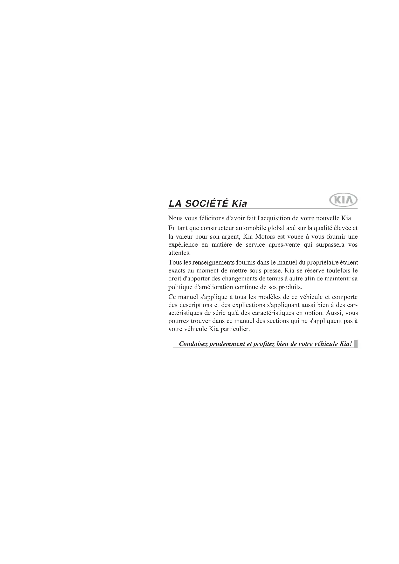 LA SOCIÉTÉ Kia Nous vous félicitons d'avoir fait l'acquisition de votre nouvelle Kia. En tant que constructeur automobile global axé sur la qualité élevée et la valeur pour son argent, Kia Motors est vouée à vous fournir une expérience en matière de service après-vente qui surpassera vos attentes. Tous les renseignements fournis dans le manuel du propriétaire étaient exacts au moment de mettre sous presse. Kia se réserve toutefois le droit d'apporter des changements de temps à autre afin de maintenir sa politique d'amélioration continue de ses produits. Ce manuel s'applique à tous les modèles de ce véhicule et comporte des descriptions et des explications s'appliquant aussi bien à des car- actéristiques de série qu'à des caractéristiques en option. Aussi, vous pourrez trouver dans ce manuel des sections qui ne s'appliquent pas à votre véhicule Kia particulier. Conduisez prudemment et profitez bien de votre véhicule Kia! KH CAN (FRE) foreword:2018 4/19/2017 10:24 AM Page 1Avant-propos