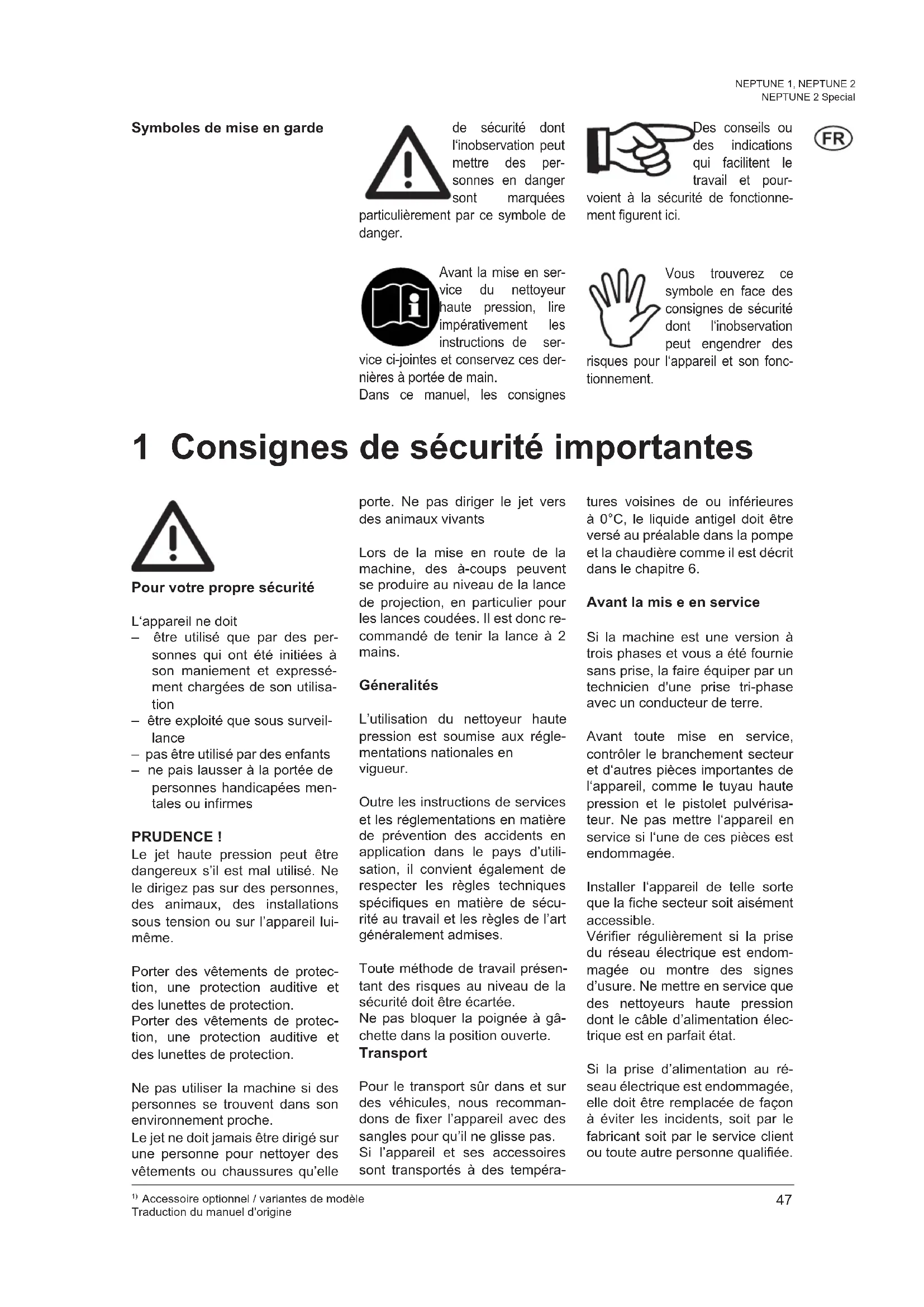 Accessoire optionnel / variantes de modèle Traduction du manuel d’origine NEPTUNE 1, NEPTUNE 2 NEPTUNE 2 Special Symboles de mise en gar de 1 Consignes de sécurité im por tan tes 2 Description 3 Avant la mise en service 4 Commande / Fonc tion ne ment 5 Domaines d’utilisation et méthodes de travail 6 Après le travail 7 Maintenance 8 Suppression de dé ran ge ments 9 Divers Sommaire