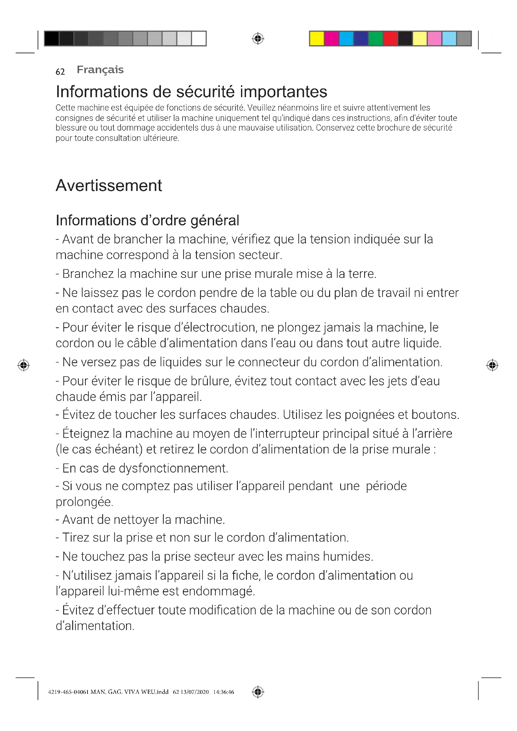 Informations de sécurité importantes Cette machine est équipée de fonctions de sécurité. Veuillez néanmoins lire et suivre attentivement les consignes de sécurité et utiliser la machine uniquement tel qu’indiqué dans ces instructions, an d’éviter toute blessure ou tout dommage accidentels dus à une mauvaise utilisation. Conservez cette brochure de sécurité pour toute consultation ultérieure. Avertissement Informations d’ordre général - Avant de brancher la machine, vériez que la tension indiquée sur la machine correspond à la tension secteur. - Branchez la machine sur une prise murale mise à la terre. - Ne laissez pas le cordon pendre de la table ou du plan de travail ni entrer en contact avec des surfaces chaudes. - Pour éviter le risque d’électrocution, ne plongez jamais la machine, le cordon ou le câble d’alimentation dans l’eau ou dans tout autre liquide. - Ne versez pas de liquides sur le connecteur du cordon d’alimentation. - Pour éviter le risque de brûlure, évitez tout contact avec les jets d’eau chaude émis par l’appareil. - Évitez de toucher les surfaces chaudes. Utilisez les poignées et boutons. - Éteignez la machine au moyen de l’interrupteur principal situé à l’arrière (le cas échéant) et retirez le cordon d’alimentation de la prise murale : - En cas de dysfonctionnement. - Si vous ne comptez pas utiliser l’appareil pendant une période prolongée. - Avant de nettoyer la machine. - Tirez sur la prise et non sur le cordon d’alimentation. - Ne touchez pas la prise secteur avec les mains humides. - N’utilisez jamais l’appareil si la che, le cordon d’alimentation ou l’appareil lui-même est endommagé. - Évitez d’effectuer toute modication de la machine ou de son cordon d’alimentation. 4219-465-04061 MAN. GAG. VIVA WEU.indd 62 13/07/2020 14:36:4663 Français - Effectuez uniquement les réparations auprès d’un centre de service autorisé par Gaggia pour éviter tout risque. - La machine ne peut être utilisée par des enfants âgés de moins de 8 ans. - Cette machine peut être utilisée par des enfants âgés de 8 ans ou plus, des personnes dont les capacités physiques, sensorielles ou intellectuelles sont réduites ou des personnes manquant d’expérience et de connaissances, à condition que ces enfants ou personnes soient sous surveillance ou qu’ils aient reçu des instructions quant à l’utilisation sécurisée de la machine et qu’ils aient pris connaissance des dangers encourus. - Le nettoyage et l’entretien ne peuvent pas être réalisés par des enfants sauf s’ils sont âgés de plus de 8 ans et sous surveillance. - Tenez la machine et son cordon hors de portée des enfants de moins de 8 ans. - Veillez à ce que les enfants ne jouent pas avec l’appareil. - Soyez prudent lorsque vous versez de l’eau chaude. De petits jets d’eau chaude peuvent précéder l’écoulement de l’eau. Attendez la n du cycle de distribution avant de retirer la buse de distribution de l’eau chaude. Attention Informations d’ordre général - Cette machine est uniquement destinée à un usage domestique normal. Elle ne peut être utilisée dans des environnements tels que des cuisines réservées aux employés dans les entreprises, magasins, fermes et autres environnements de travail. - Placez toujours l’appareil sur une surface stable et plane. Maintenez-le en position verticale, également pendant le transport. - Ne placez pas la machine sur une plaque chauffante ou directement à côté d’un four chaud, d’un appareil de chauffage ou d’une source similaire de chaleur. 4219-465-04061 MAN. GAG. VIVA WEU.indd 63 13/07/2020 14:36:46Français