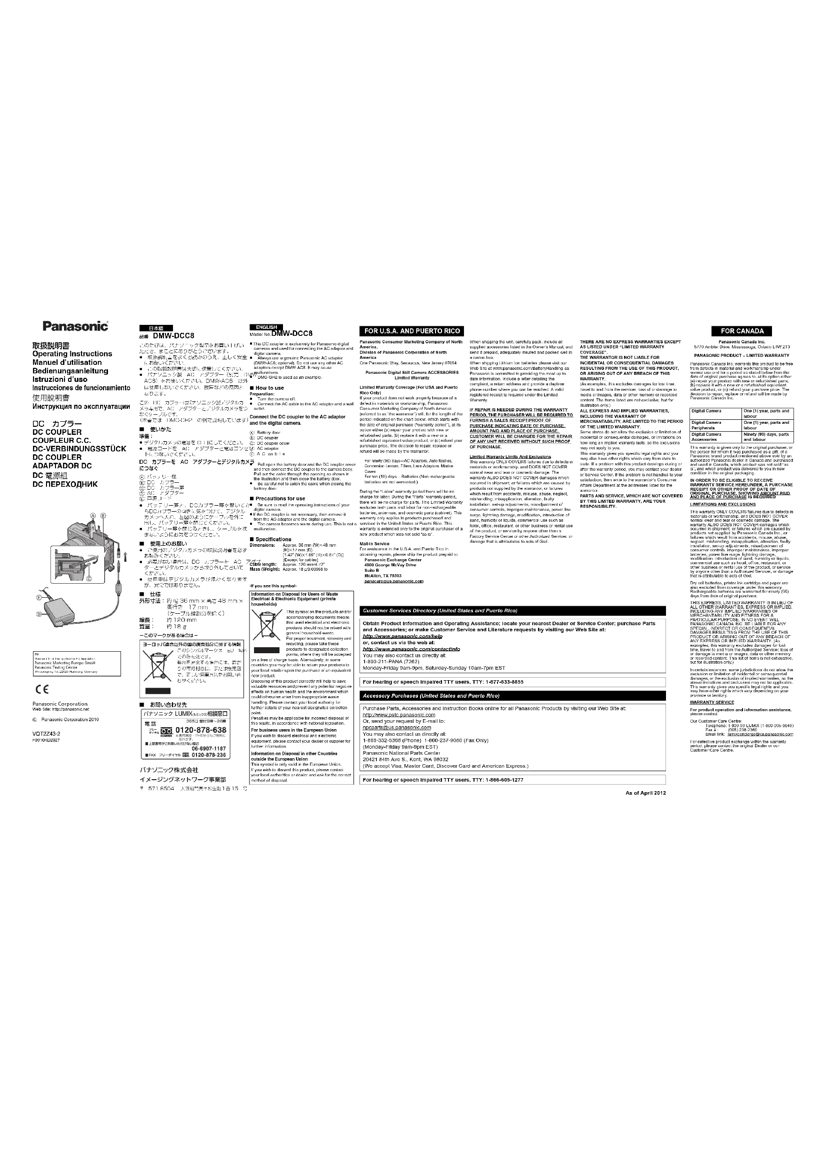 F0910KD2027 As of April 2012 Customer Services Directory (United States and Puerto Rico) Obtain Product Information and Operating Assistance; locate your nearest Dealer or Service Center; purchase Parts and Accessories; or make Customer Service and Literature requests by visiting our Web Site at: http://www.panasonic.com/help or, contact us via the web at: http://www.panasonic.com/contactinfo You may also contact us directly at: 1-800-211-PANA (7262) Monday-Friday 9am-9pm, Saturday-Sunday 10am-7pm EST For hearing or speech impaired TTY users, TTY: 1-877-833-8855 Accessory Purchases (United States and Puerto Rico) Purchase Parts, Accessories and Instruction Books online for all Panasonic Products by visiting our Web Site at: http://www.pstc.panasonic.com Or, send your request by E-mail to: npcparts@us.panasonic.com You may also contact us directly at: 1-800-332-5368 (Phone) 1-800-237-9080 (Fax Only) (Monday-Friday 9am-9pm EST) Panasonic National Parts Center 20421 84th Ave S., Kent, WA 98032 (We accept Visa, Master Card, Discover Card and American Express.) For hearing or speech impaired TTY users, TTY: 1-866-605-1277 DMW-DCC8.fm 1 ページ 2017年2月14日 火曜日 午後8時29分N° de modèle DMW-DCC8 ≥ Ce coupleur c.c. a été conçu exclusivement pour les appareils photos numériques Panasonic et sert à raccorder l’adaptateur secteur à l’appareil photo numérique. ≥ Assurez-vous de toujours utiliser un adaptateur secteur de marque Panasonic (modèle DMW-AC8; en option). N’utilisez aucun autre adaptateur que le DMW-AC8. Ceci pourrait entraîner des défauts de fonctionnement. ≥ DMC-GH2 utilisé à titre d’exemple. ∫ Comment l’utiliser Préparatifs: ≥ Mettez l’appareil hors marche. ≥ Raccordez le câble c.a. à l’adaptateur secteur et branchez-le dans une prise secteur. Raccordez le coupleur c.c. à l’adaptateur secteur et à l’appareil photo numérique. A: Couvercle du logement de la batterieB: Coupleur c.c.C: Bouchon de protection de la prise du coupleur c.c.D: Adaptateur secteurE: Câble c.a. ≥ Tirez pour ouvrir le couvercle du logement de la batterie et le bouchon de protection de la prise du coupleur c.c., puis connectez le coupleur c.c. au boîtier de l’appareil photo. Tirez le câble à travers l’ouverture comme indiqué dans l’illustration, puis fermez le couvercle du logement de la batterie. ≥ Prenez soin de ne pas accrocher le câble en fermant le couvercle du logement de la batterie. ∫ Précautions d’utilisation ≥ Assurez-vous de lire le manuel d’utilisation de votre appareil photo numérique. ≥ Si le coupleur c.c. n’est pas nécessaire, débranchez- le de l’adaptateur secteur et de l’appareil photo. ≥ L’appareil photo chauffe pendant l’utilisation. Ceci n’est pas un défaut de fonctionnement. ∫ Spécifications Dimensions:Environ mm (L)k48