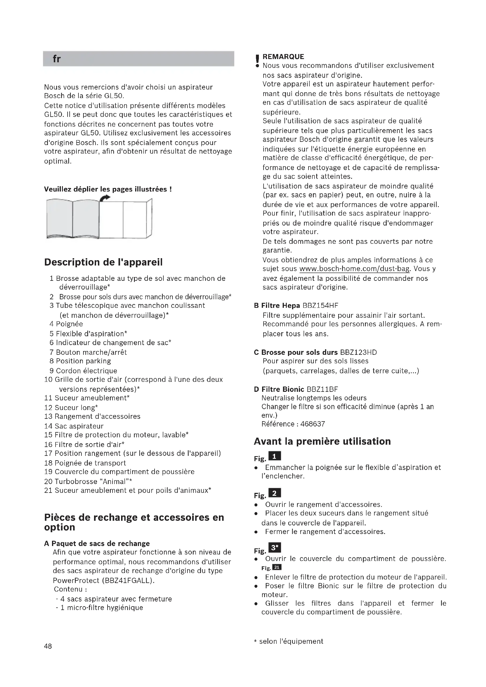 REMARQUE Nous vous recommandons d'utiliser exclusivement nos sacs aspirateur d'origine. Votre appareil est un aspirateur hautement perfor- mant qui donne de très bons résultats de nettoyage en cas d'utilisation de sacs aspirateur de qualité supérieure. Seule l'utilisation de sacs aspirateur de qualité supérieure tels que plus particulièrement les sacs aspirateur Bosch d'origine garantit que les valeurs indiquées sur l'étiquette énergie européenne en matière de classe d'efficacité énergétique, de per- formance de nettoyage et de capacité de remplissa- ge du sac soient atteintes. L'utilisation de sacs aspirateur de moindre qualité (par ex. sacs en papier) peut, en outre, nuire à la durée de vie et aux performances de votre appareil. Pour finir, l'utilisation de sacs aspirateur inappro- priés ou de moindre qualité risque d'endommager votre aspirateur. De tels dommages ne sont pas couverts par notre garantie. Vous obtiendrez de plus amples informations à ce sujet sous www.bosch-home.com/dust-bag . Vous y avez également la possibilité de commander nos sacs aspirateur d'origine. B Filtre Hepa BBZ154HF Filtre supplémentaire pour assainir l'air sortant. Recommandé pour les personnes allergiques. A rem- placer tous les ans. C Brosse pour sols durs BBZ123HD Pour aspirer sur des sols lisses (parquets, carrelages, dalles de terre cuite,...) D Filtre Bionic BBZ11BF Neutralise longtemps les odeurs Changer le filtre si son efficacité diminue (après 1 an env.) Référence : 468637 Avant la première utilisation Fig. ● Emmancher la poignée sur le flexible d’aspiration et l’enclencher. Fig. ● Ouvrir le rangement d'accessoires. ● Placer les deux suceurs dans le rangement situé dans le couvercle de l'appareil. ● Fermer le rangement d'accessoires. Fig. ● Ouvrir le couvercle du compartiment de poussière. Fig. ● Enlever le filtre de protection du moteur de l'appareil. ● Poser le filtre Bionic sur le filtre de protection du moteur. ● Glisser les filtres dans l'appareil et fermer le couvercle du compartiment de poussière.